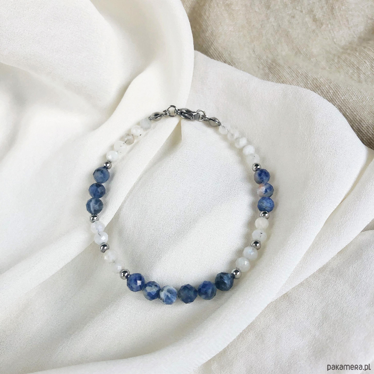 Piękna bransoletka wykonana z kamieni naturalnych: fasetowanych kamieni księżycowych 4 mm oraz granatowych sodalitów Przekładki 3mm oraz zapięcia wykonane ze stali chirurgicznej w kolorze srebrnym.