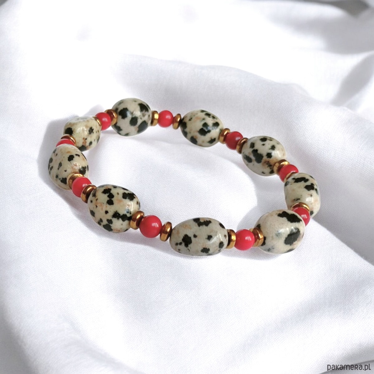 Bransoletka na solidnej gumce jubilerskiej - wykonana z połączenia jaspisu dalmatyńskiego (nieregularne, polerowane bryłki - wielkość ok. 10-12mm) , czerwonego korala 5mm oraz przekładek ze złotego hematytu.