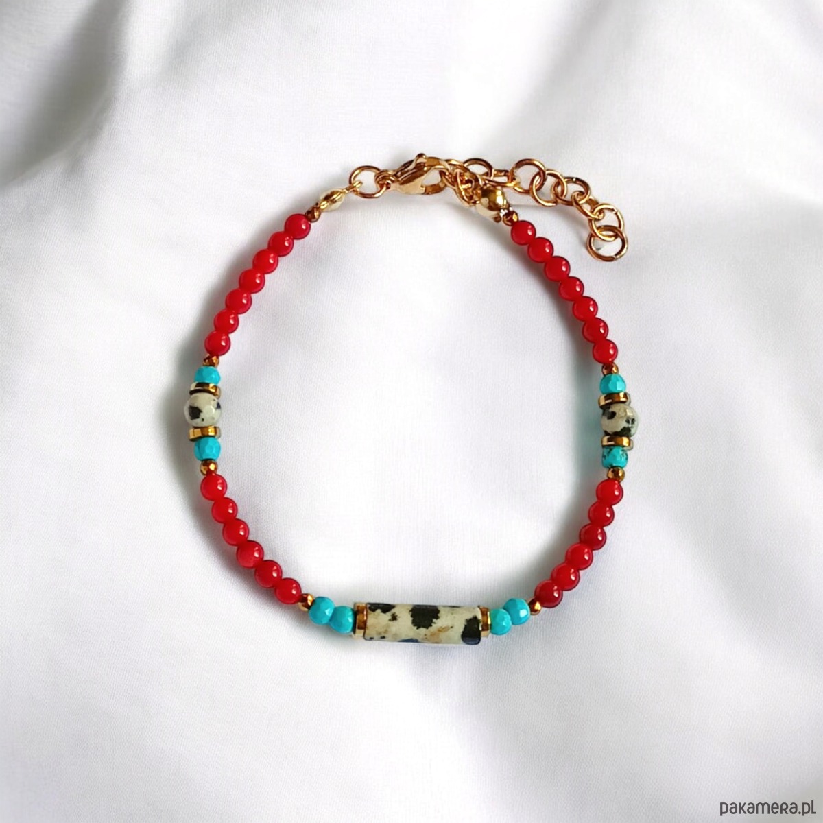 Bransoletka wykonana z połączenia jaspisu dalmatyńskiego (walce 4x13mm) , czerwonego korala 3mm i fasetowanego magnezytu (3mm) oraz przekładek ze złotego hematytu.
