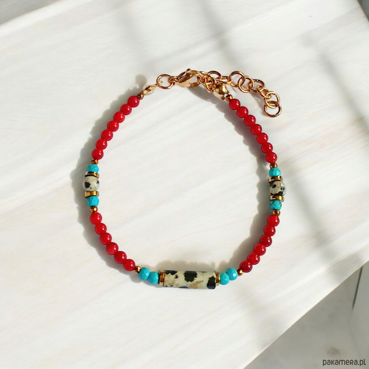 Bransoletka wykonana z połączenia jaspisu dalmatyńskiego (walce 4x13mm) , czerwonego korala 3mm i fasetowanego magnezytu (3mm) oraz przekładek ze złotego hematytu.