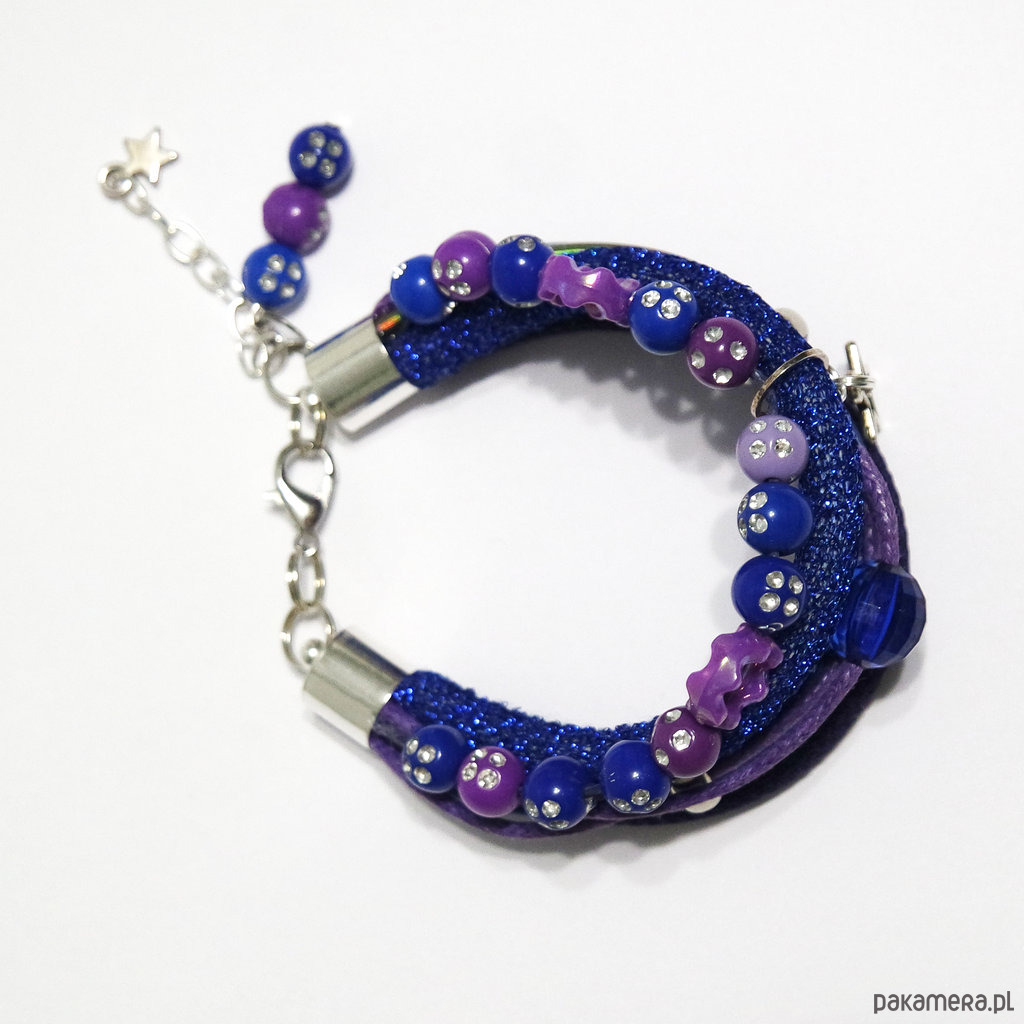 Bransoletka zrobiona jest z rzemieni z eko-skóry, materiału, sznurka i koralików.