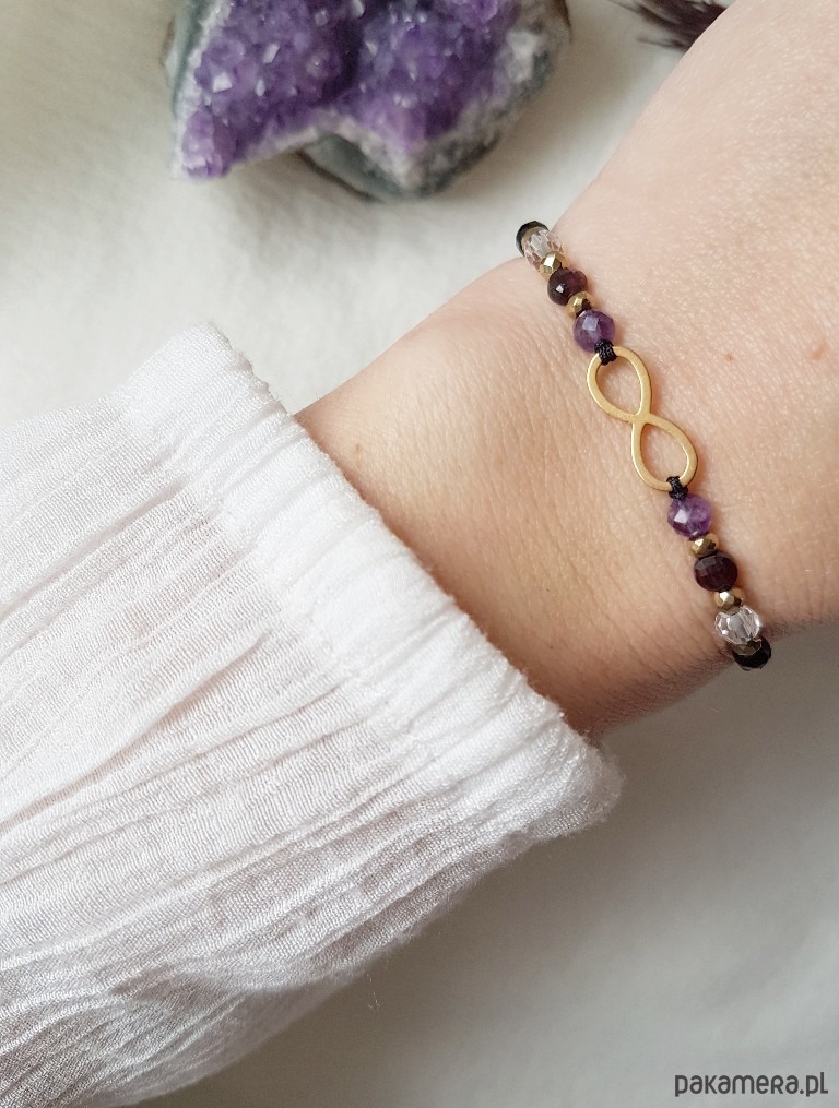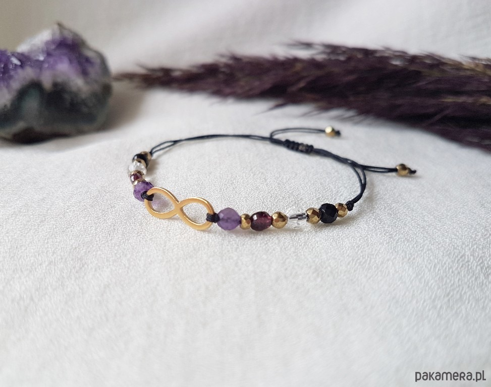 Regulowana bransoletka Nieskończoności z Ametystem, Kryształem Górskim, Granatem, Czarnym Turmalinem
