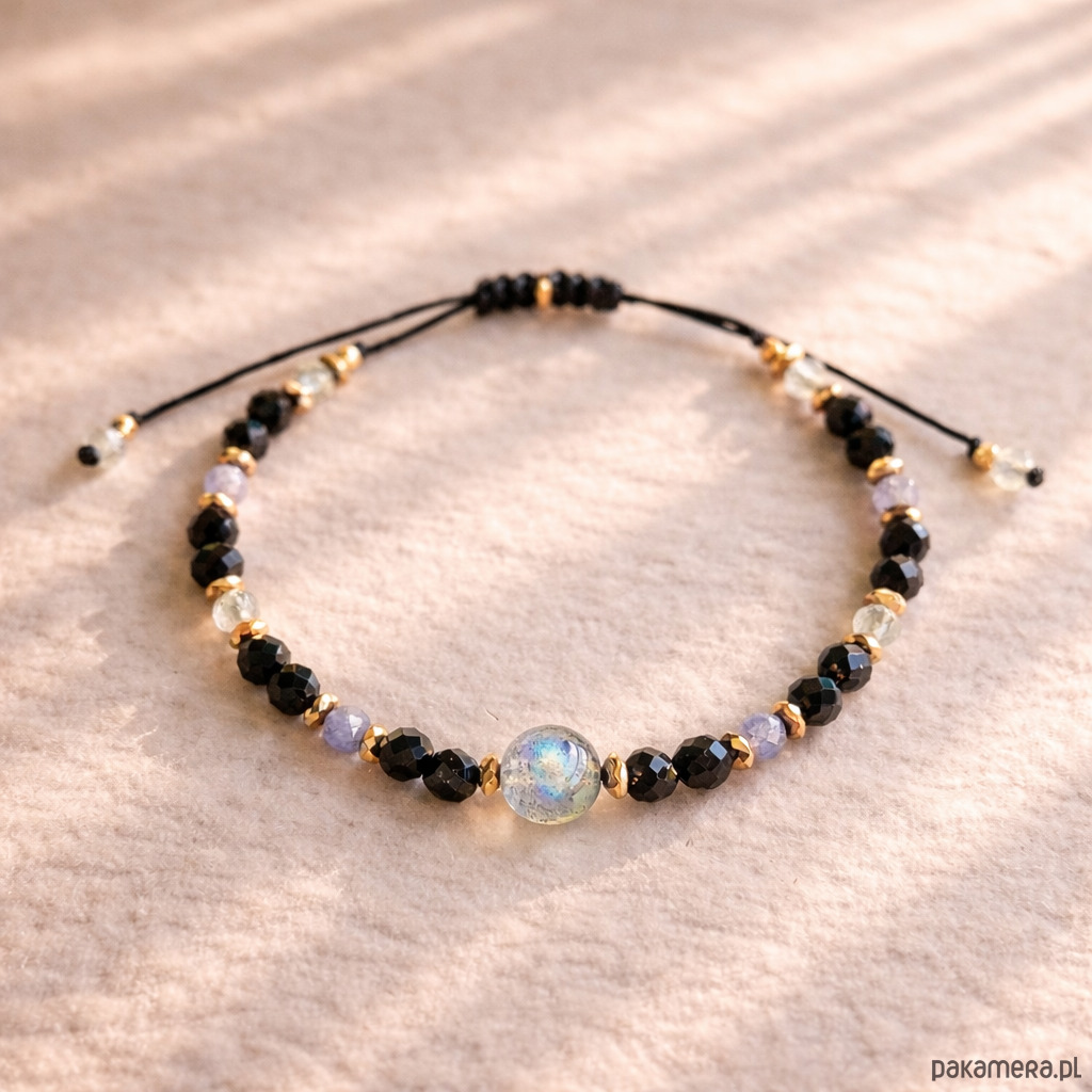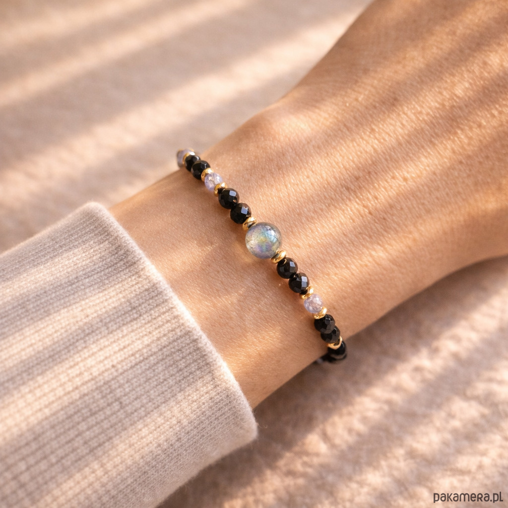 * labradoryt - jest kamieniem kreatywności, intuicji i duchowego oświecenia. Wspiera w wyciszeniu umysłu i otworzeniu się na strumień nowych pomysłów i idei, które możesz wykorzystać w swoim życiu. Labradoryt w tej bransoletce wykazuje piękny efekt iryzacji, przywodząc na myśli zaklętą w skale zorzę polarną.