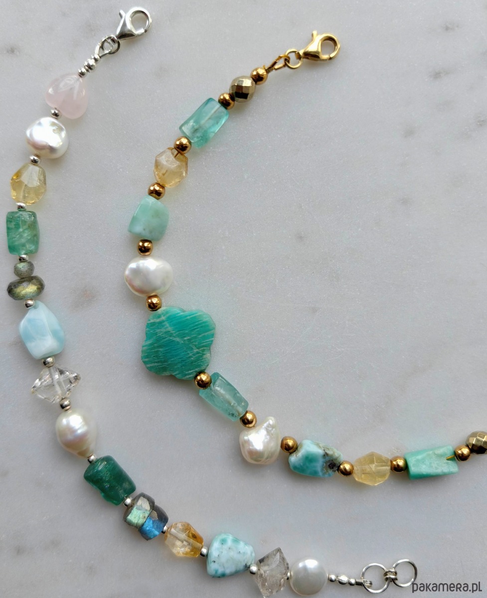 Bazą są perły, kamienie larimaru i cytrynu. Główną ozdoba to ładnie ubarwiony amazonit w kształcie marokańskiej koniczyny. Złocony hematyt oraz pozłacane srebro ocieplają całość, generują blask.