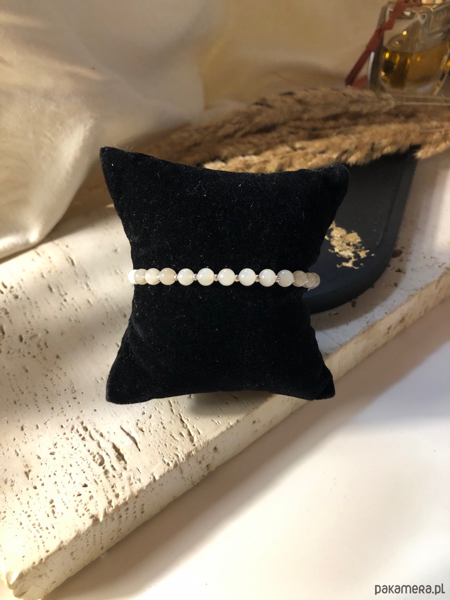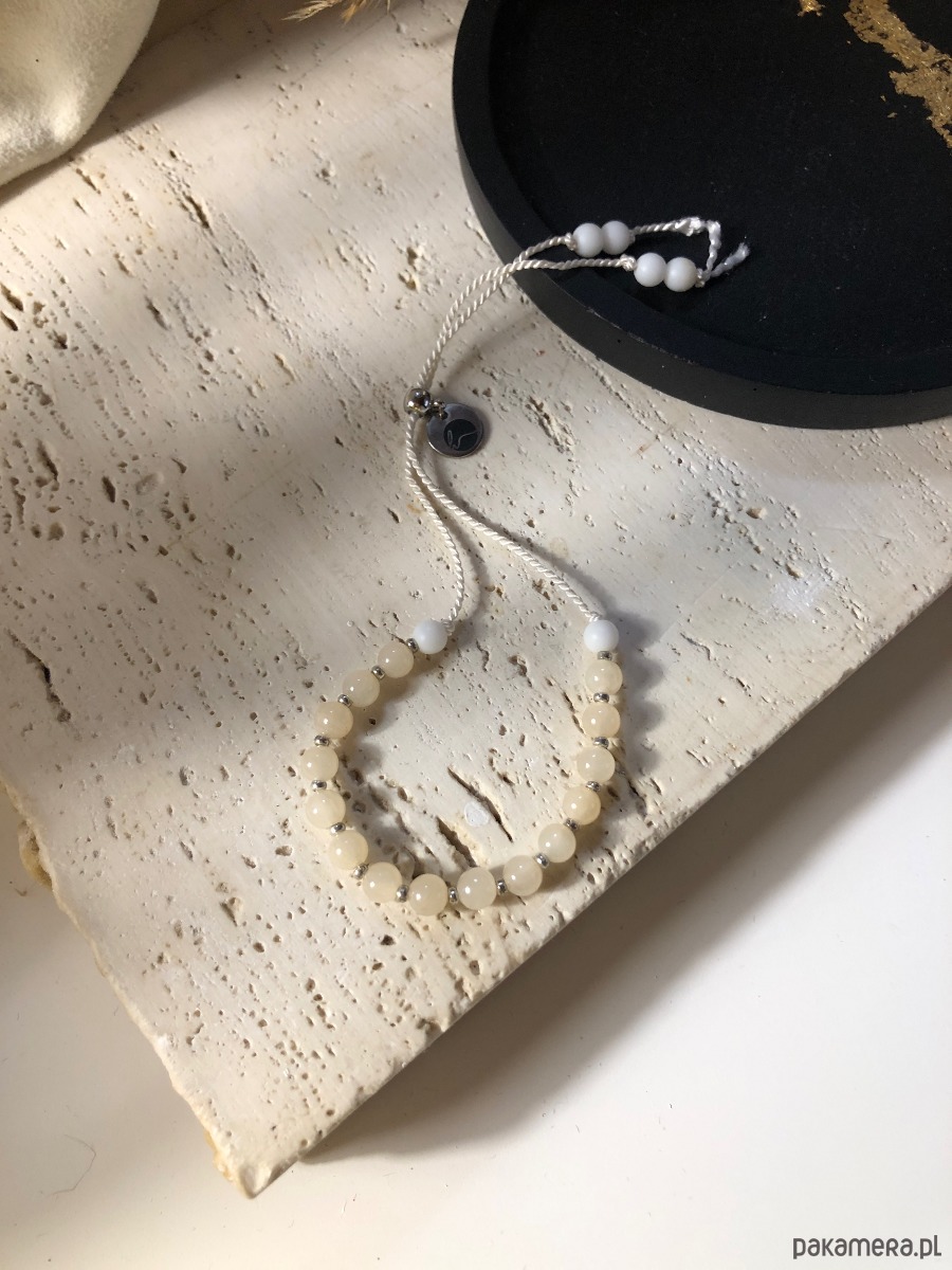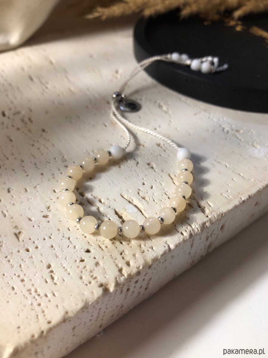 Bransoletka wykonana z naturalnych kamieni. Rozmiar bransoletki można regulować za pomocą stopera z gumką w środku. Na nić jedwabną nawleczono kamienie o jadeitu marmurkowego w odcieniu brzoskwiniowym i białym o średnicy 4 mm.