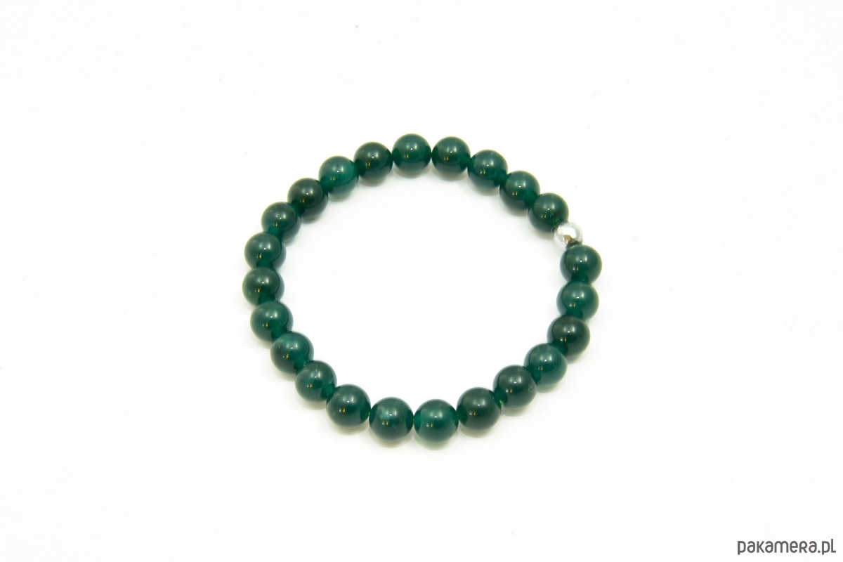 Ładna modna prosta bransoletka z wyjątkowych kul jadeitu w pięknym kolorze zieleni butelkowej. Ozdobiona delikatnym fasetowanym koralikiem hematytu prezentuje się idealnie.