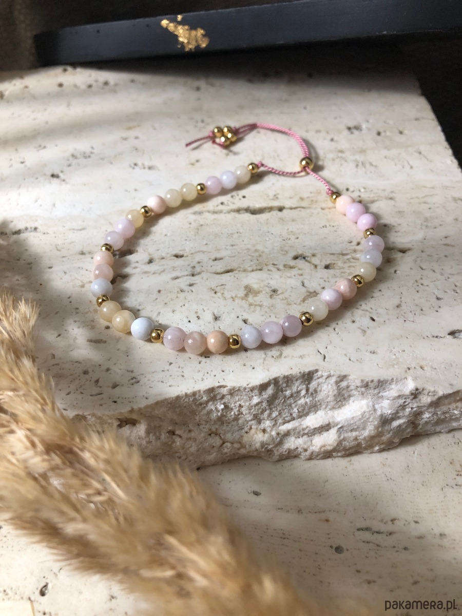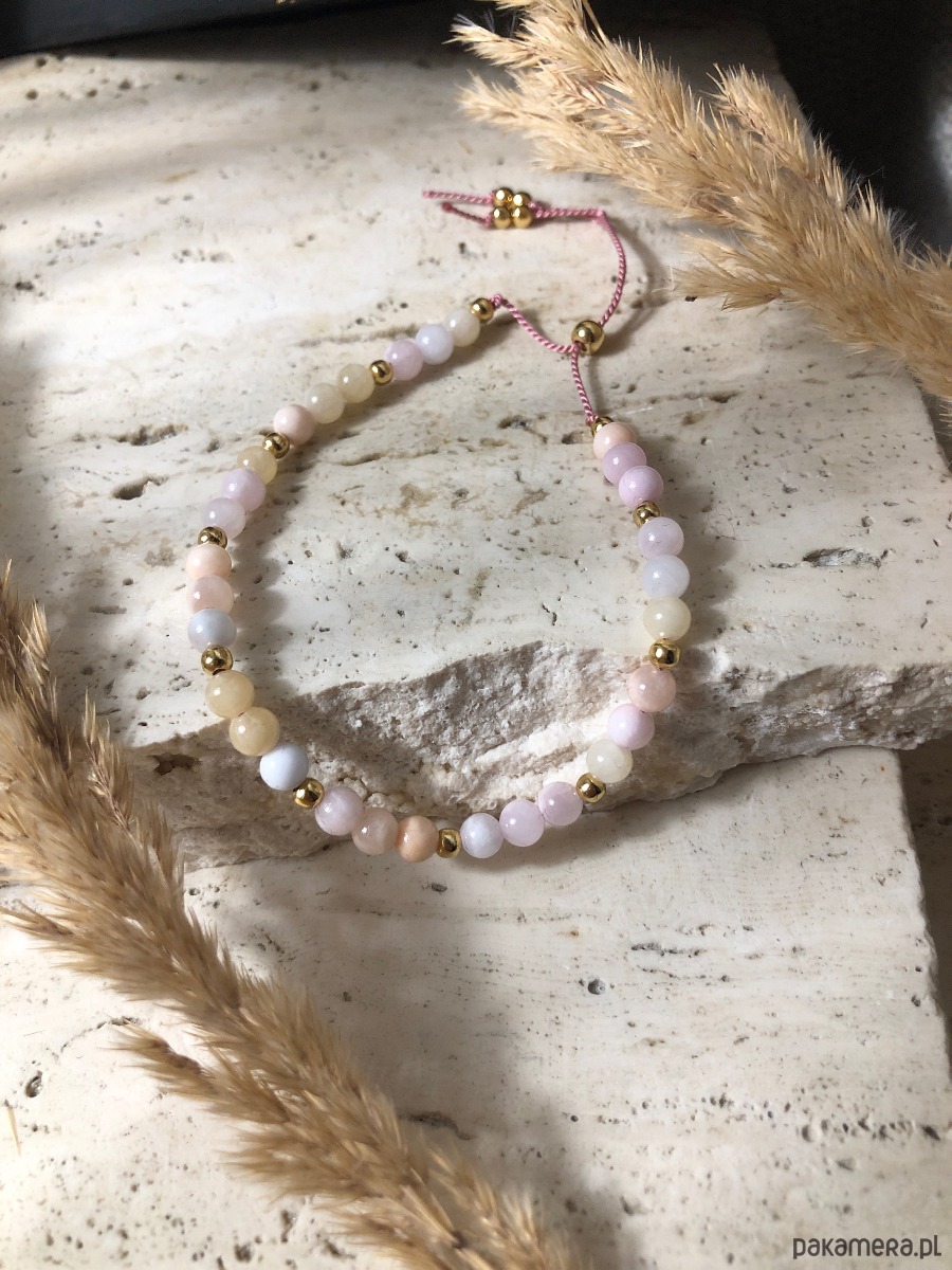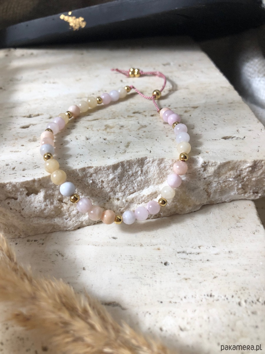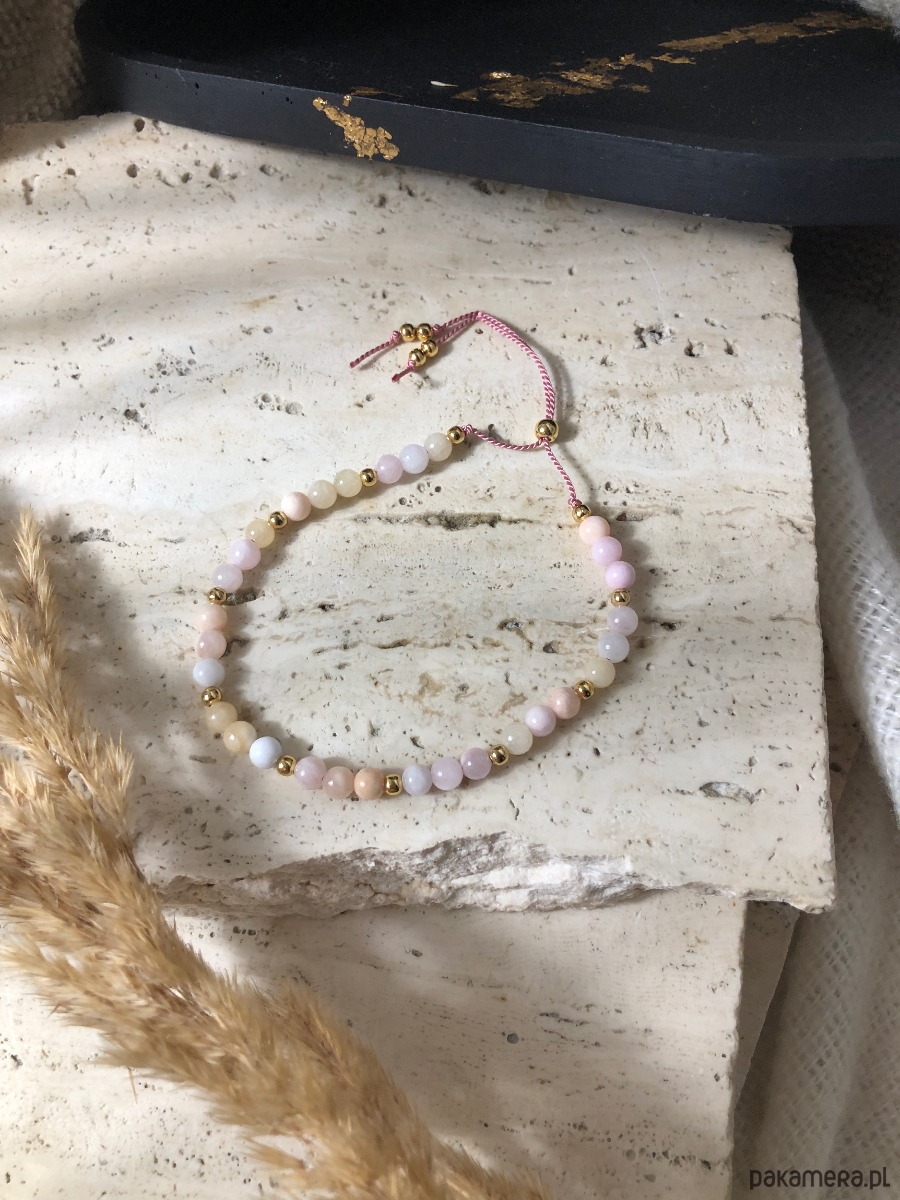 Bransoletka wykonana z kamieni naturalnych. Na nić jedwabną nawleczono jadeit o średnicy 4 mm oraz kuleczki ze stali chirurgicznej w kolorze złotym. Obwód bransoletki można regulować za pomocą przesuwanego stopera z gumką w środku.