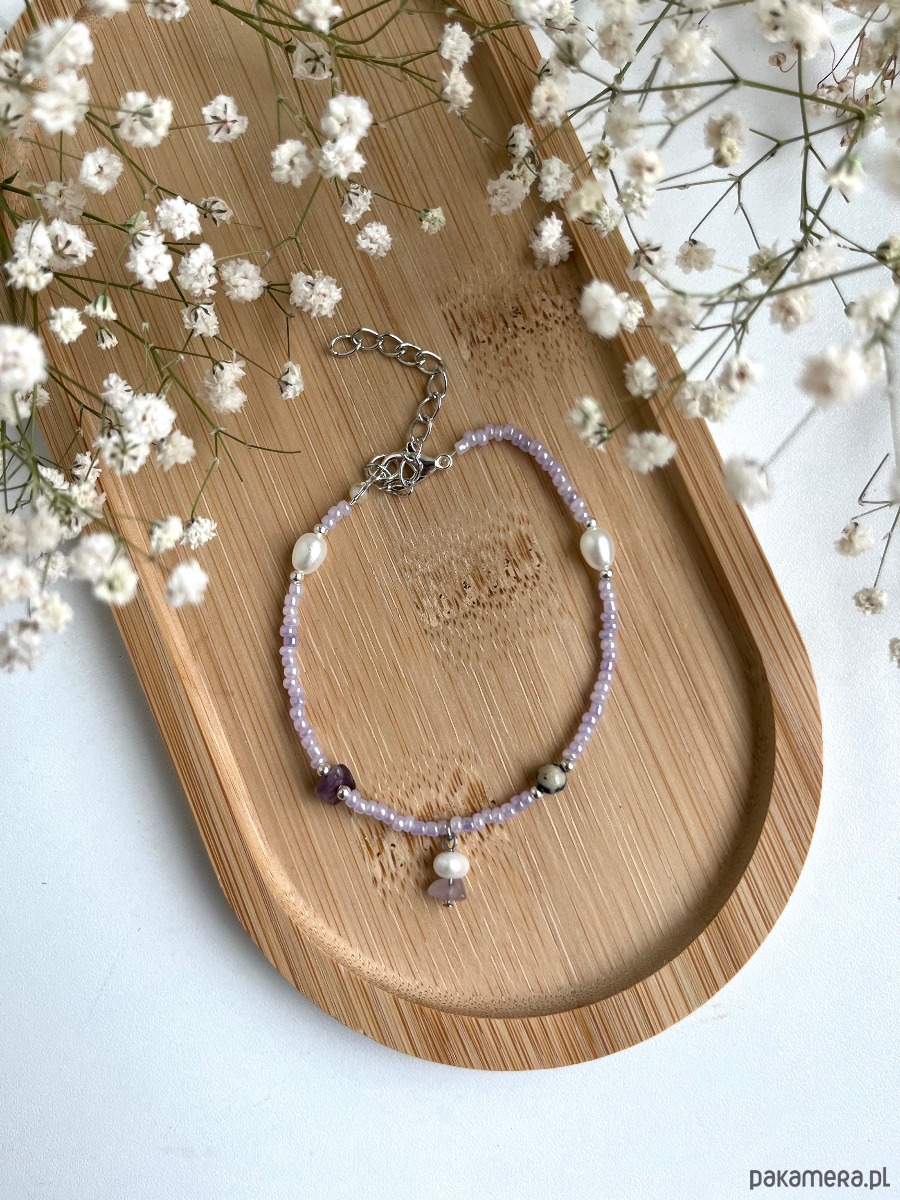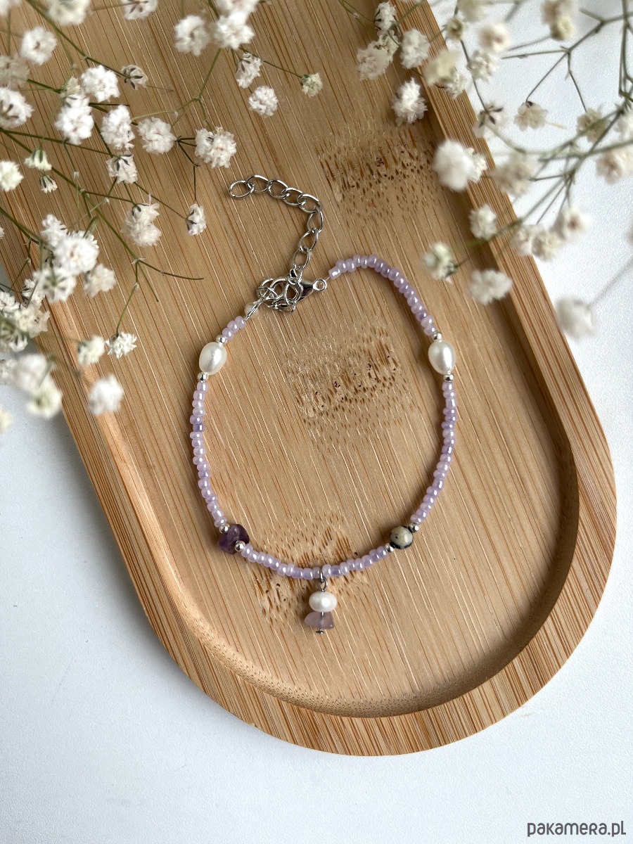 Bransoletka ręcznie wykonana ze szklanych koralików, sztucznych pereł oraz kamieni naturalnych - jaspisu dalmatyńskiego oraz ametystu.