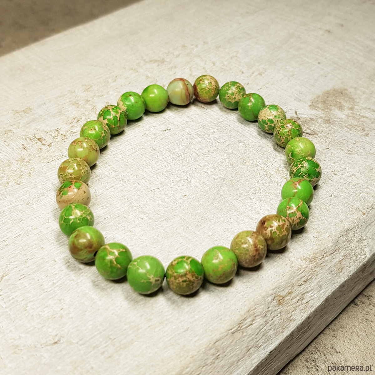 Bransoletka wykonana z wysokiej jakości kamieni jaspisu cesarskiego w kolorze jasnej zieleni 7,5mm nawleczonych na silikonową gumkę. Bransoletka pasuje na nadgarstek o obwodzie 16-18 cm.