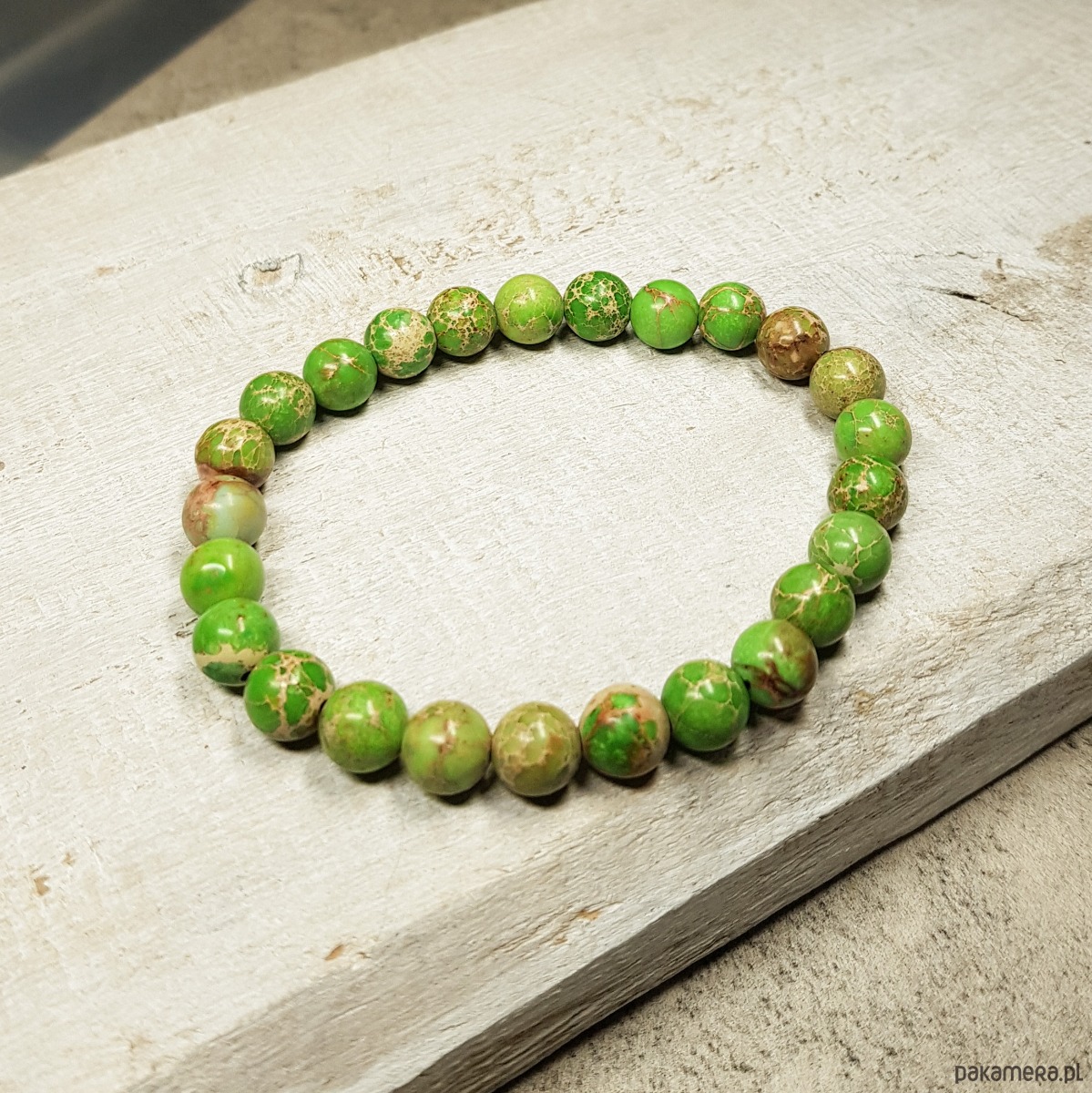 Bransoletka wykonana z wysokiej jakości kamieni jaspisu cesarskiego w kolorze jasnej zieleni 7,5mm nawleczonych na silikonową gumkę. Bransoletka pasuje na nadgarstek o obwodzie 16-18 cm.