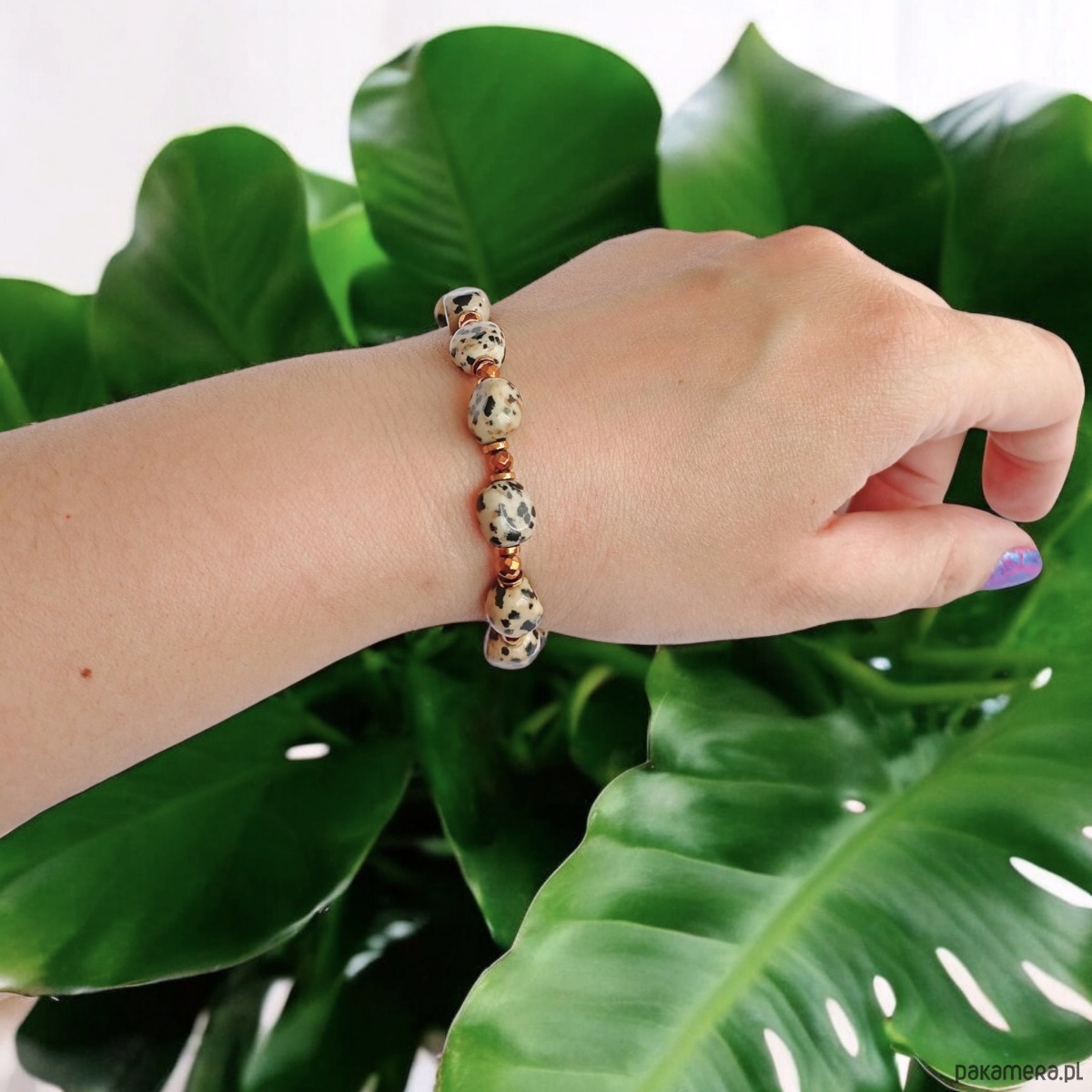 Bransoletka : jaspis dalmatyński i złoty hematyt : na gumce