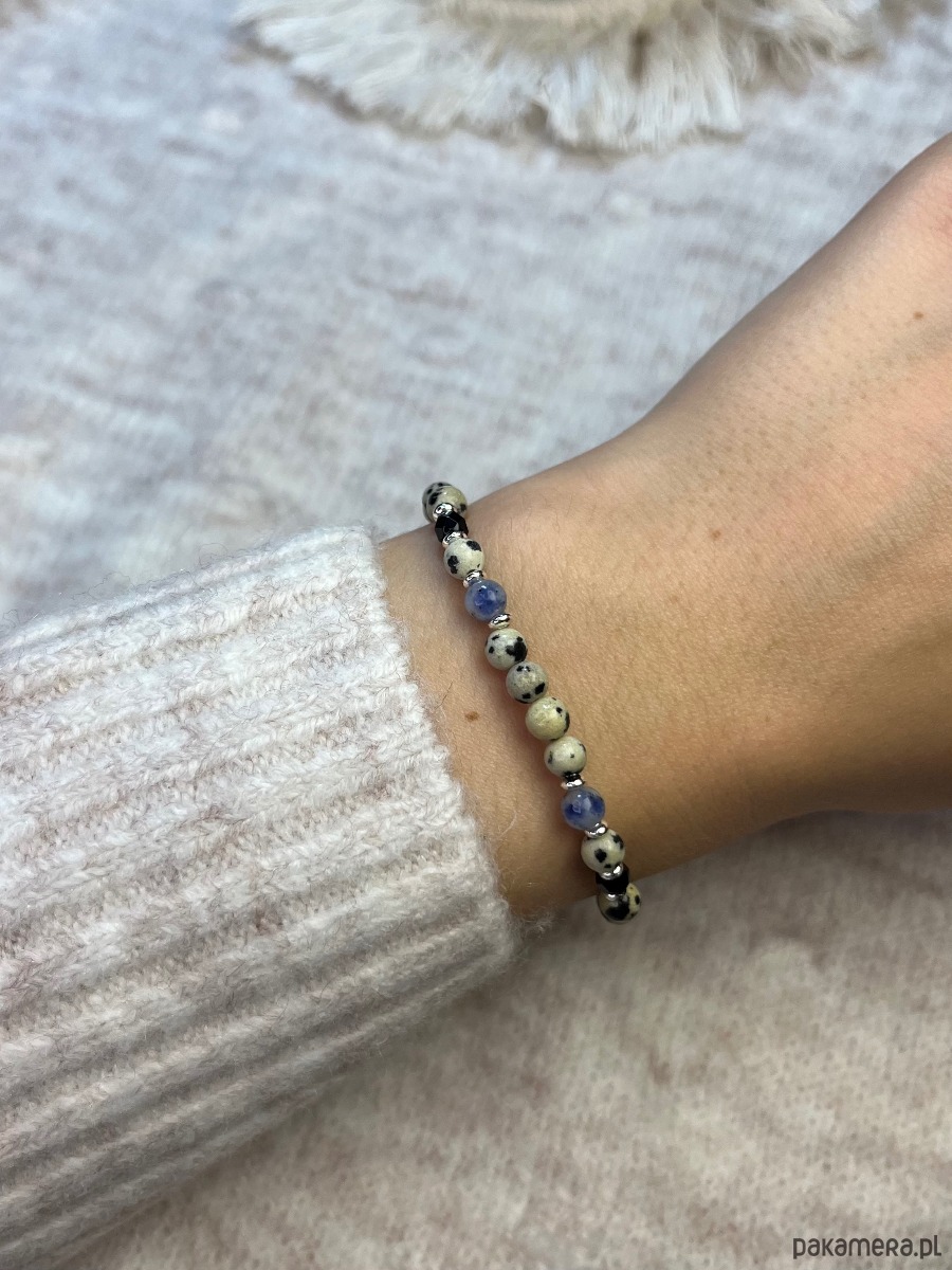 Bransoletka ręcznie wykonana z kamieni naturalnych - jaspisu dalmatyńskiego oraz jaspisu niebieskiego.