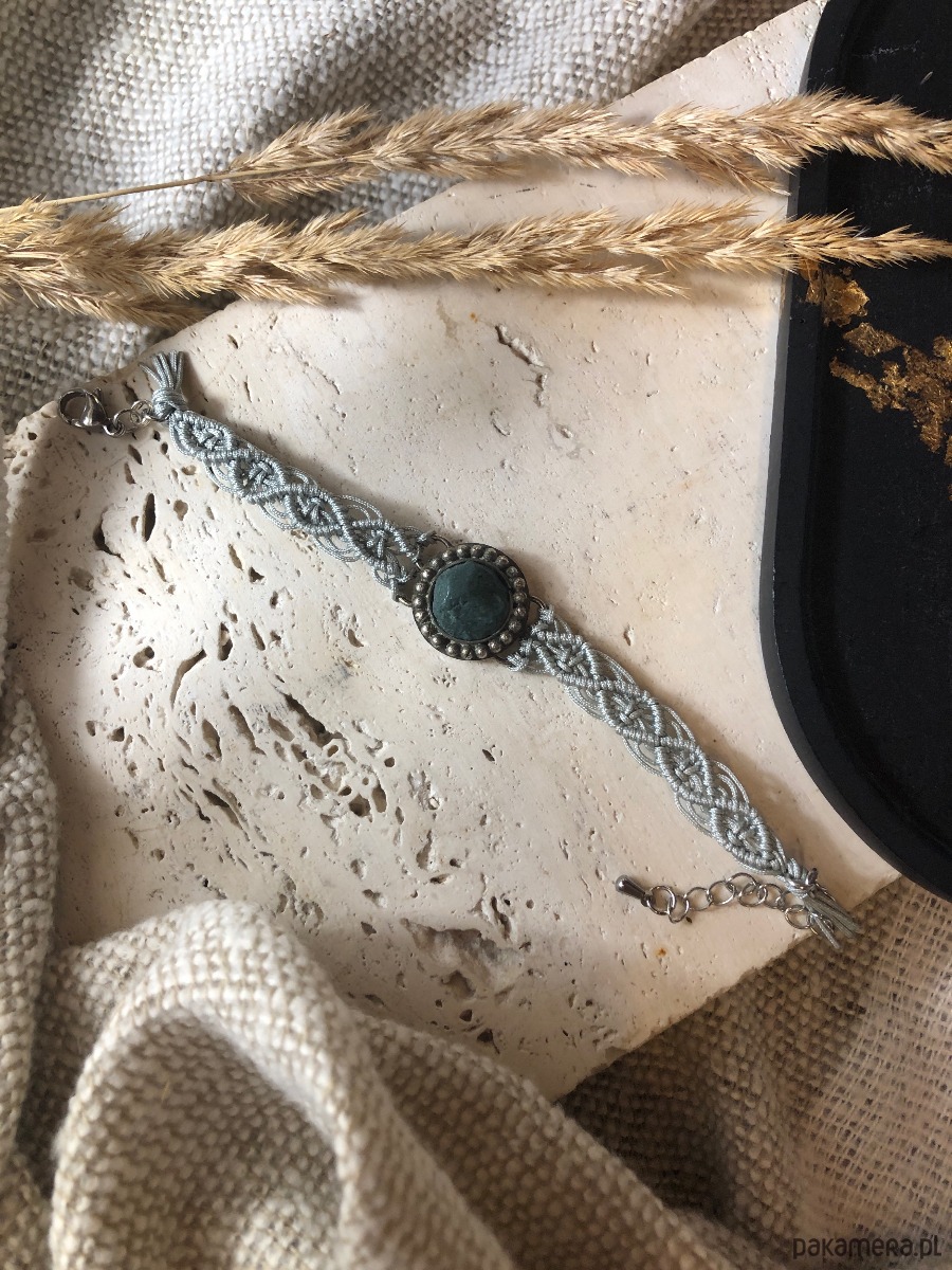 Bransoletka wypleciona ze sznurka techniką makramy z oprawionym jaspisem. Metalowy element z kamieniem pochodzi z odzysku ze starej bransolety. Został oczyszczony i ponownie wykorzystany. Bransoletka ma zapięcie typu karabińczyk z przedłużką ze stali chirurgicznej.