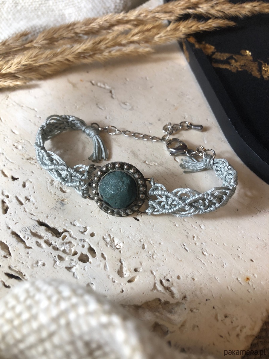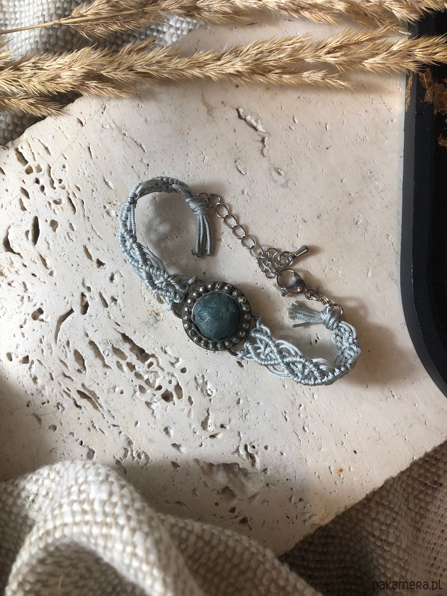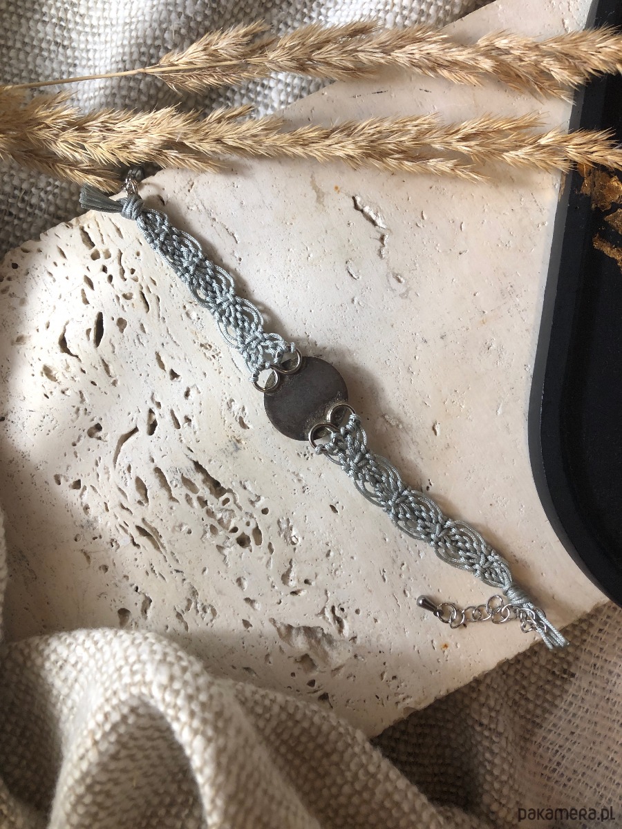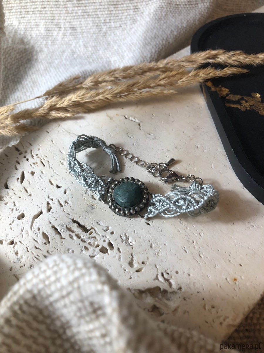 Bransoletka wypleciona ze sznurka techniką makramy z oprawionym jaspisem. Metalowy element z kamieniem pochodzi z odzysku ze starej bransolety. Został oczyszczony i ponownie wykorzystany. Bransoletka ma zapięcie typu karabińczyk z przedłużką ze stali chirurgicznej.