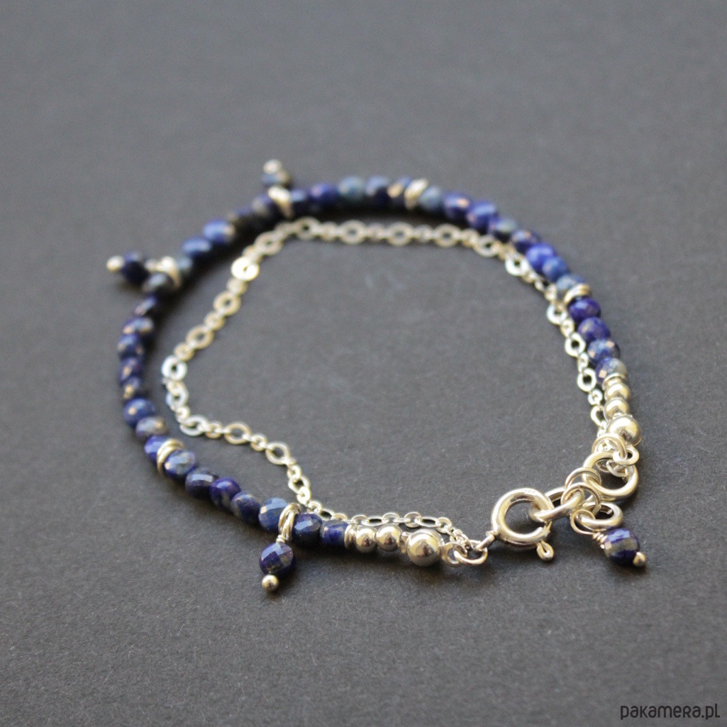 Bransoletka wykonana została ze srebra próby 925 oraz fasetowanych lapis lazuli z pirytem wielkości 0,4 cm.