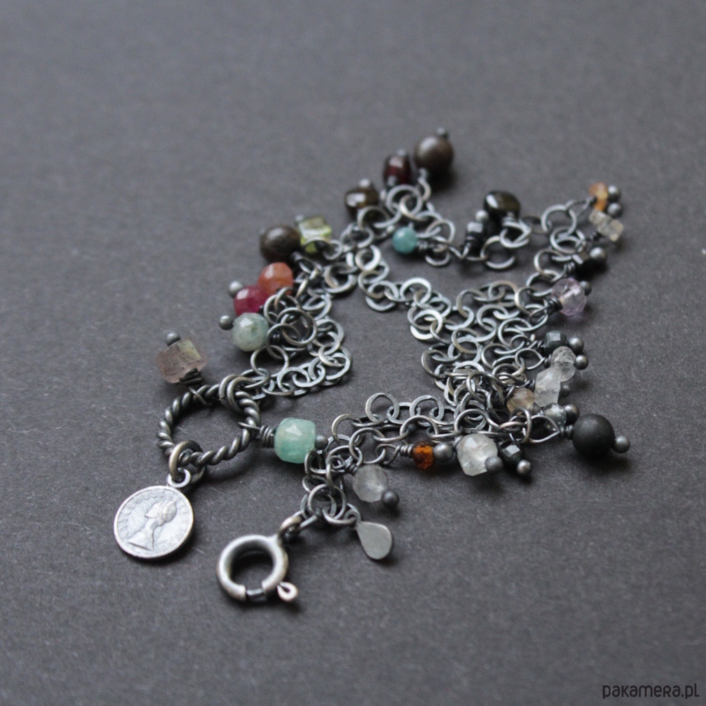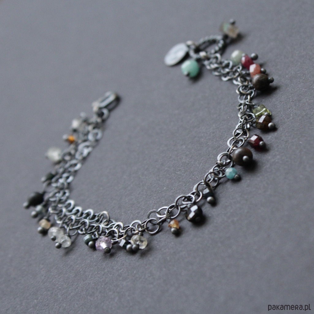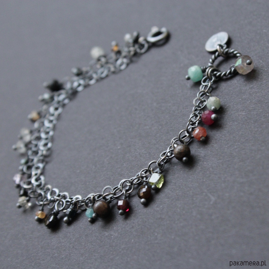 Jesienna bransoletka wykonana została z oksydowanego srebra próby 925 oraz kolorowych minerałów.