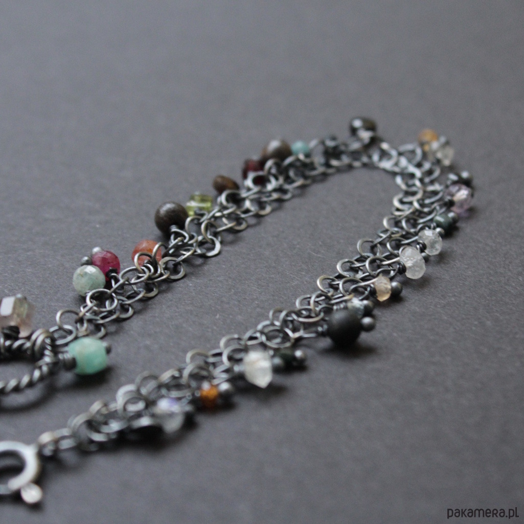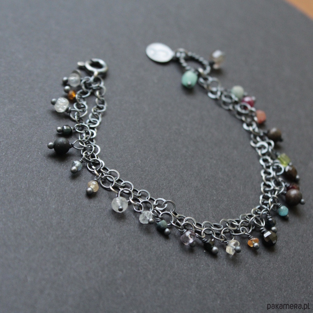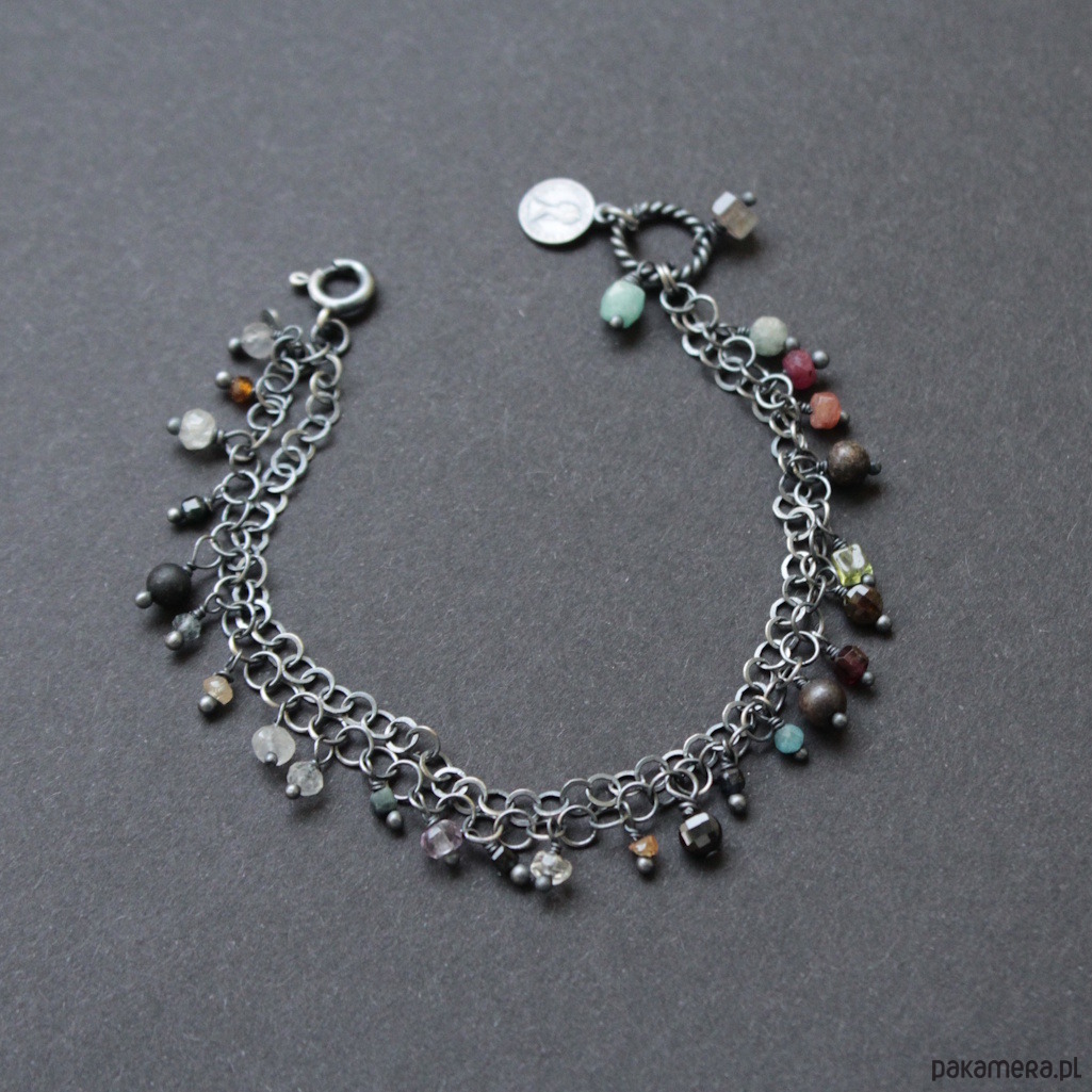 Jesienna bransoletka wykonana została z oksydowanego srebra próby 925 oraz kolorowych minerałów.