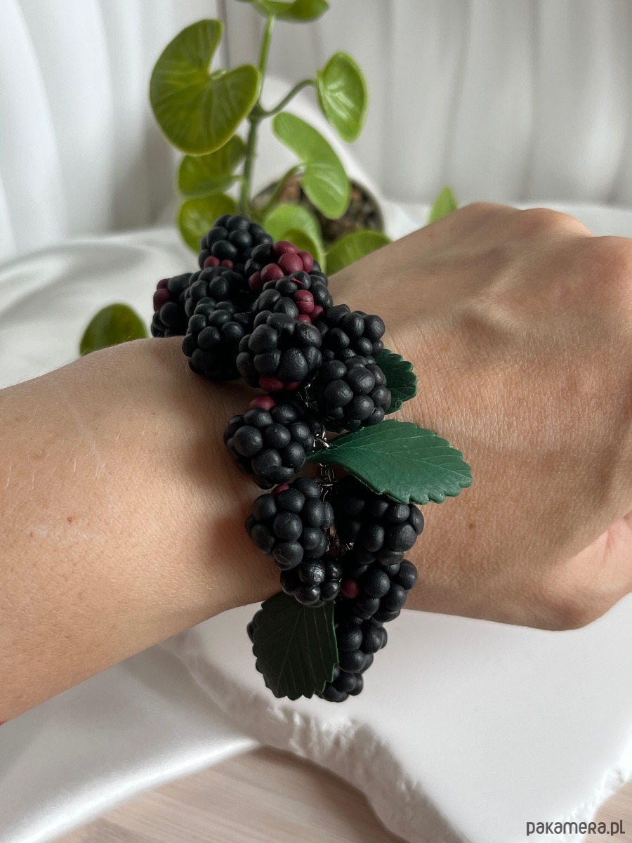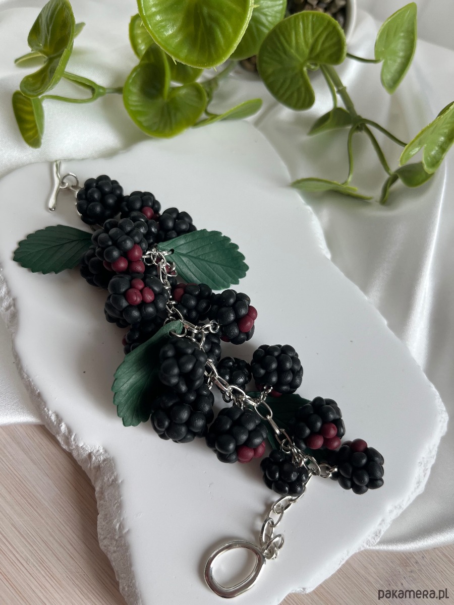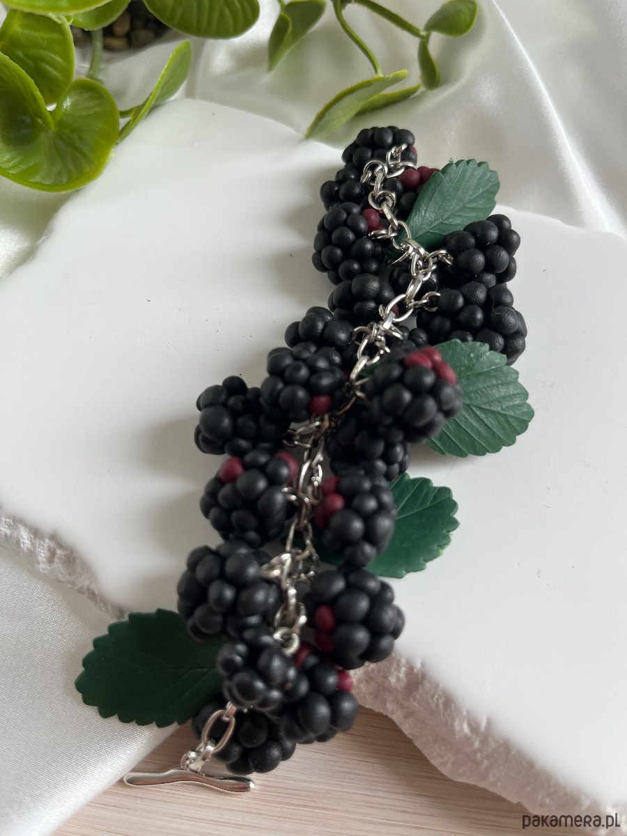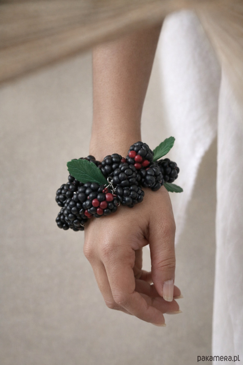 Efektowna, przestrzenna bransoletka inspirowana dojrzałymi jeżynami. Każdy owoc został ręcznie uformowany z dbałością o najmniejsze detale, co nadaje biżuterii realistyczny i naturalny charakter. Kompozycję dopełniają zielone liście, które podkreślają świeżość i leśny klimat projektu.