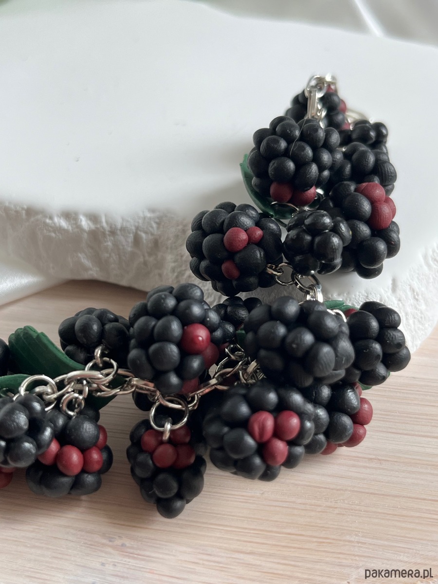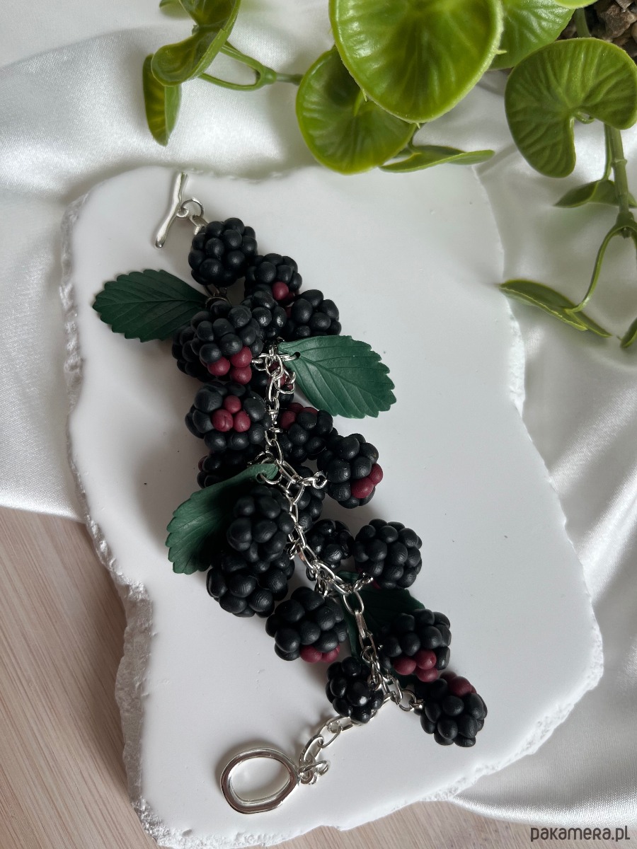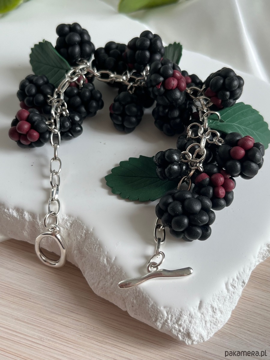 Efektowna, przestrzenna bransoletka inspirowana dojrzałymi jeżynami. Każdy owoc został ręcznie uformowany z dbałością o najmniejsze detale, co nadaje biżuterii realistyczny i naturalny charakter. Kompozycję dopełniają zielone liście, które podkreślają świeżość i leśny klimat projektu.