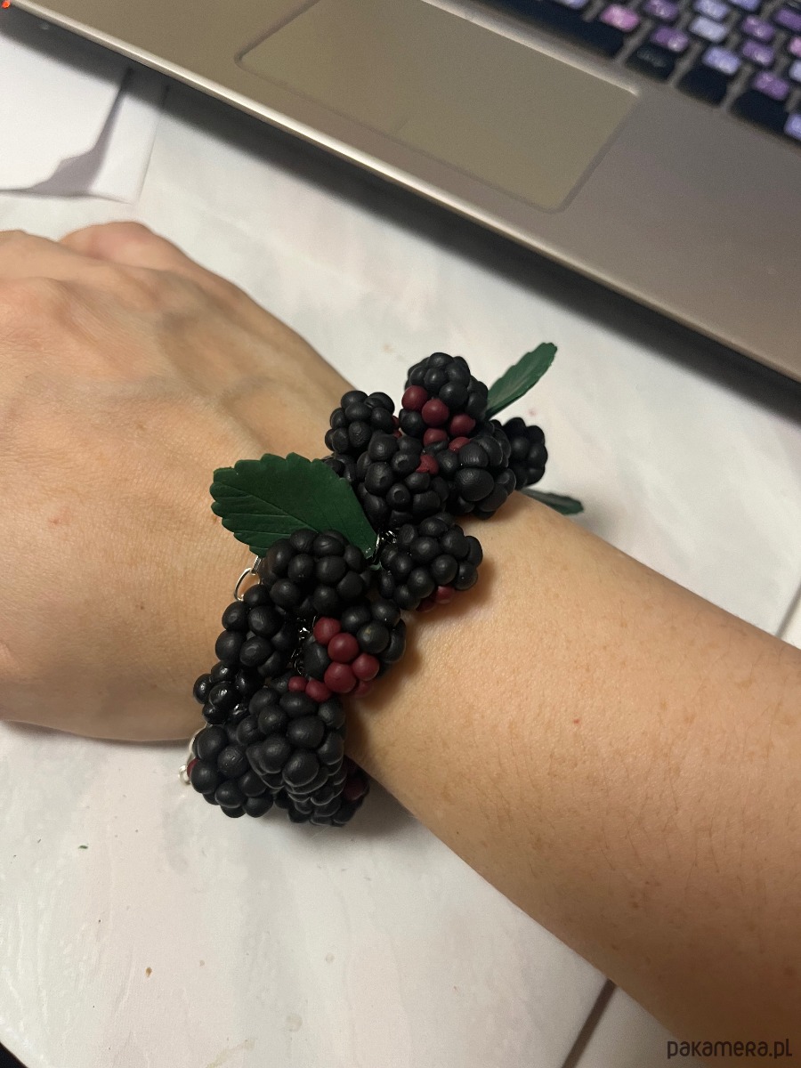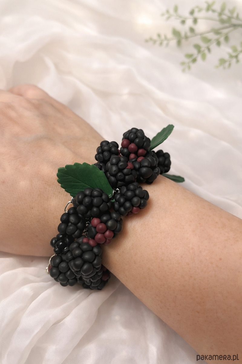 Efektowna, przestrzenna bransoletka inspirowana dojrzałymi jeżynami. Każdy owoc został ręcznie uformowany z dbałością o najmniejsze detale, co nadaje biżuterii realistyczny i naturalny charakter. Kompozycję dopełniają zielone liście, które podkreślają świeżość i leśny klimat projektu.
