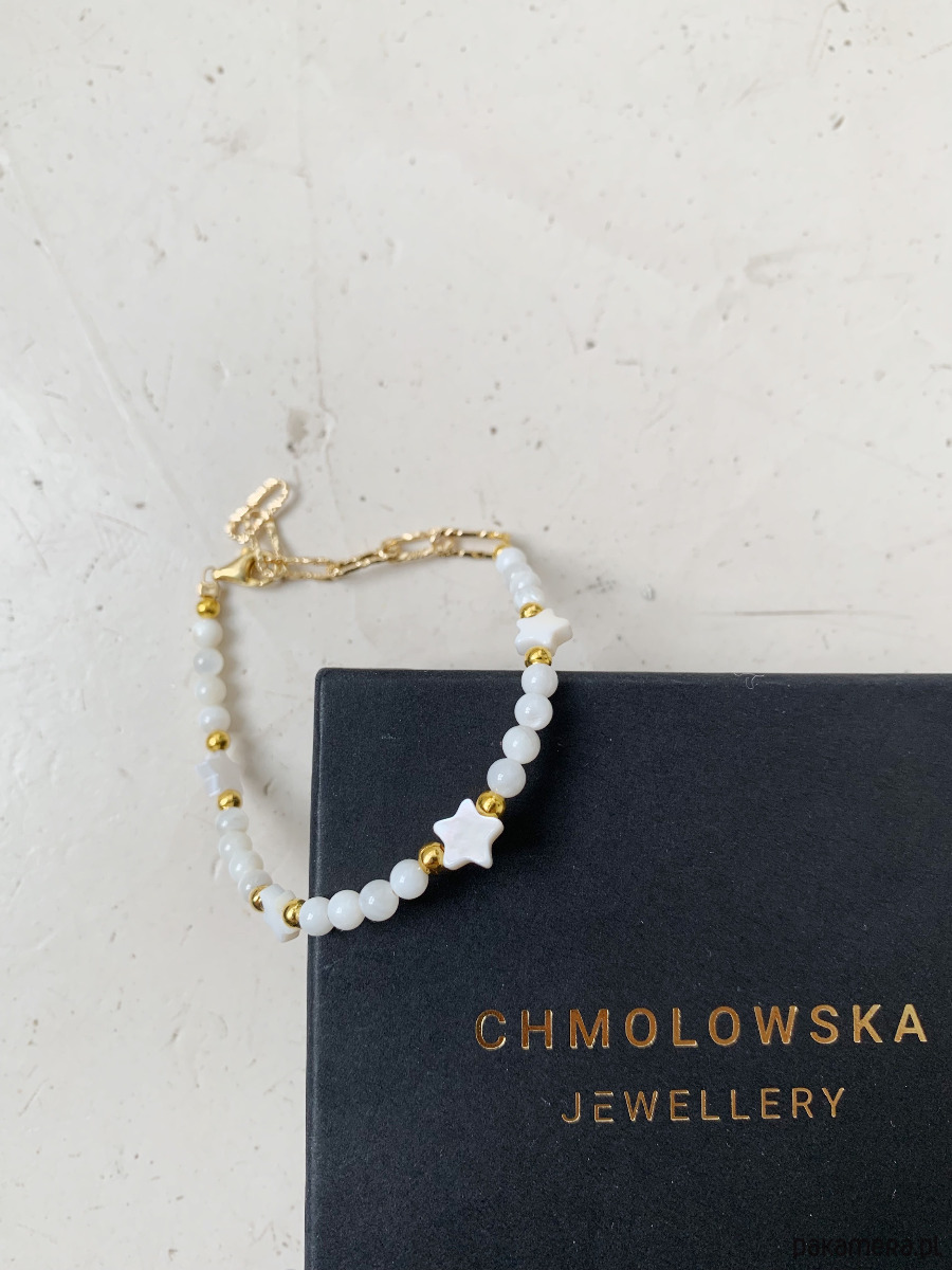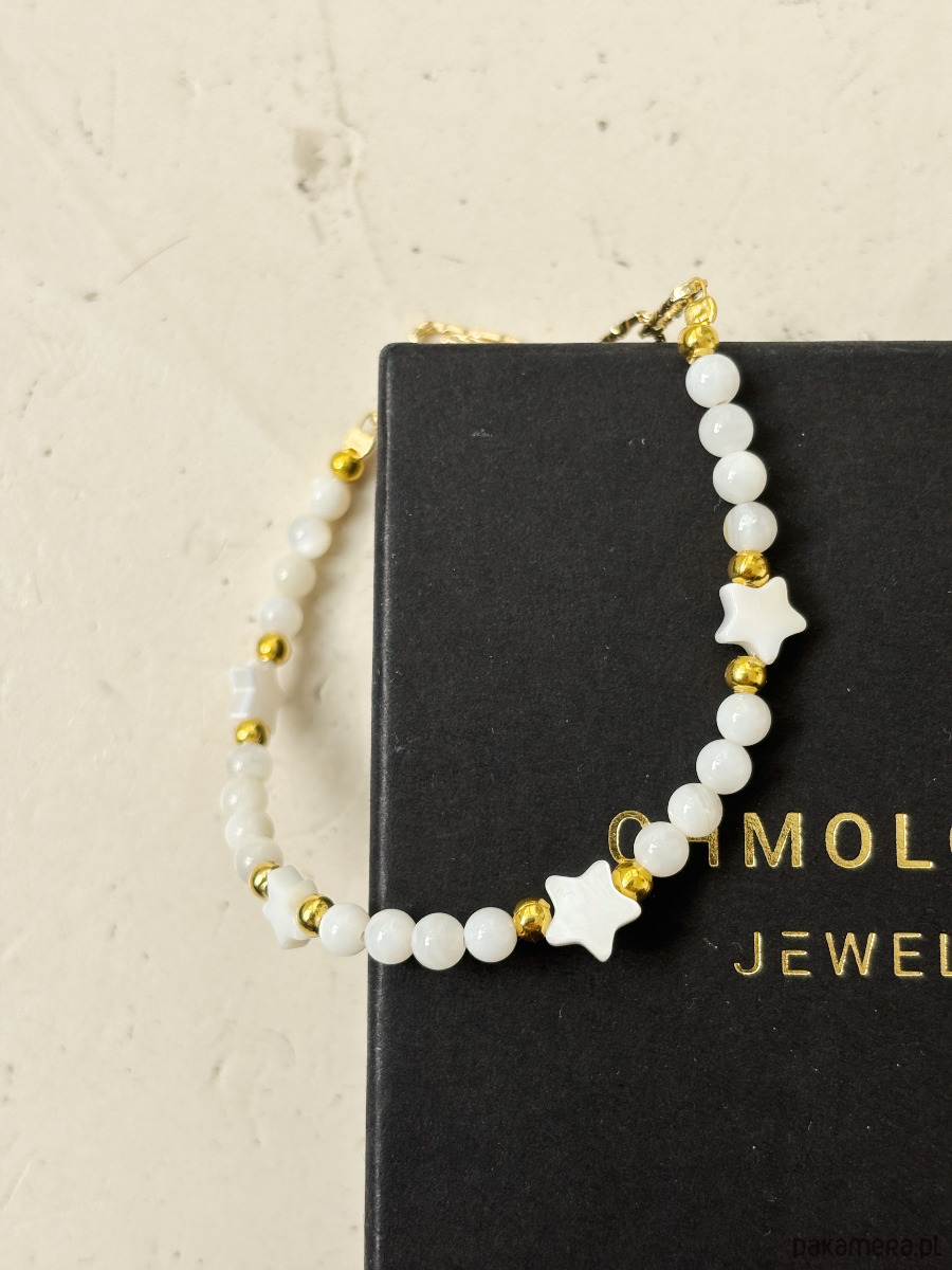 Bransoletka wykonana jest na lince jubilerskiej z użyciem kamienia księżycowego, gwiazdek z masy perłowej i zapiecia,łańcuszka rodowanych złotem.