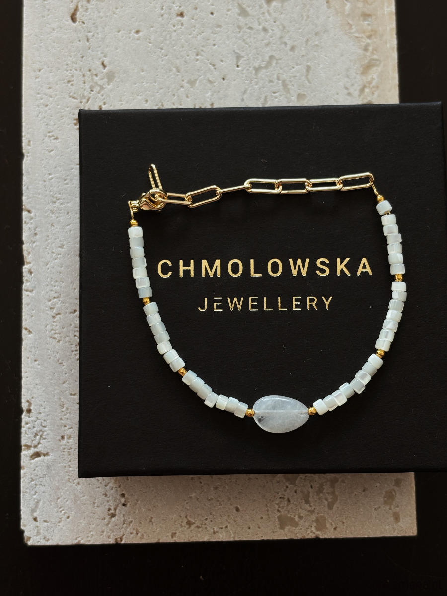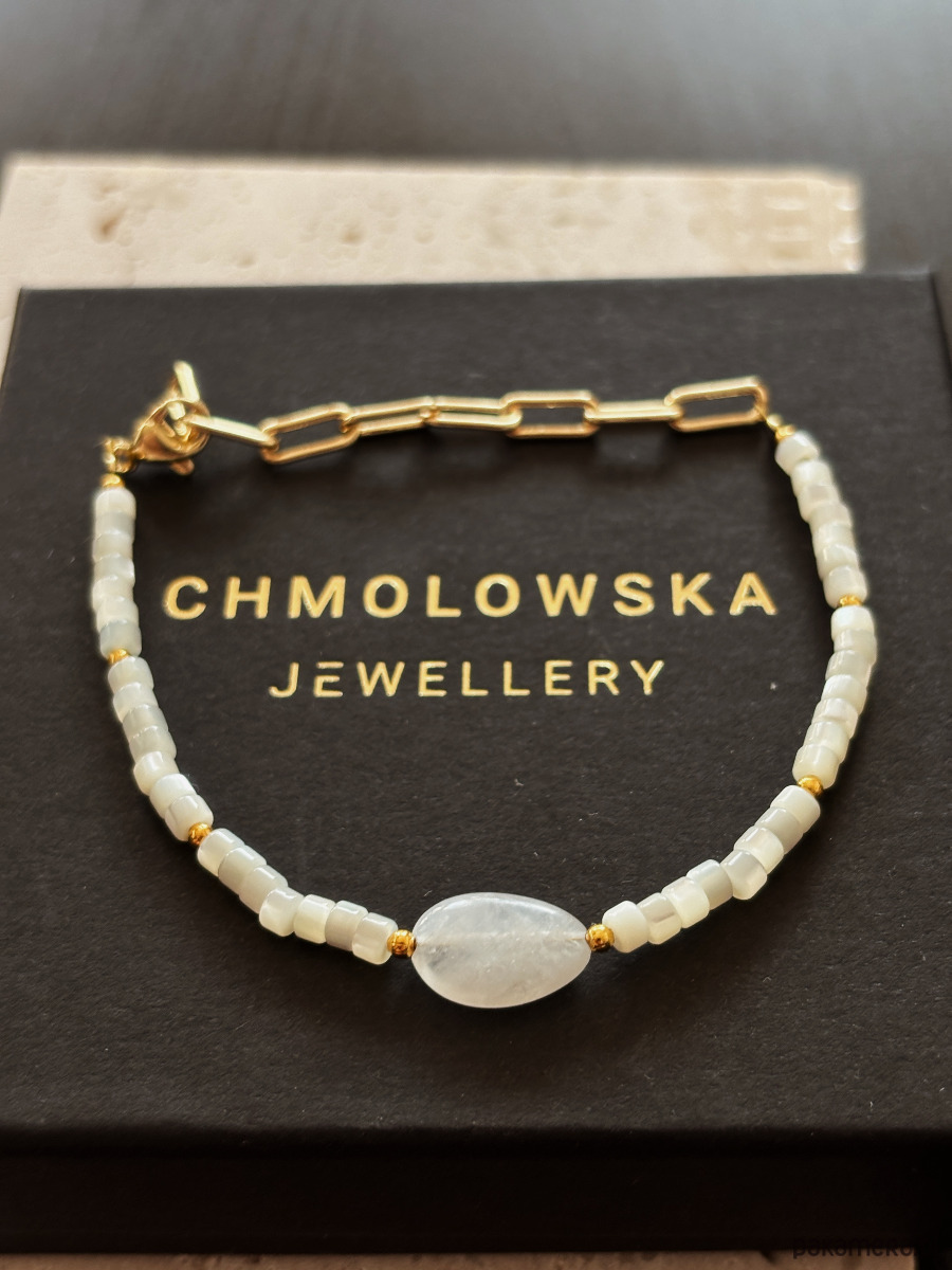 Bransoletka wykonana jest na lince jubilerskiej z Kamienia Księżycowego ( w dwóch różnycj formach), zapięcie i łańcuszek są rodowane złotem.