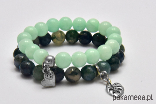 Komplet uroczych bransoletek z pięknych, zielonych fasetowanych kul agatu mszystego i miętowego jadeitu. Ozdobione uroczymi, delikatnymi zawieszkami, tworzą wspaniałą kompozycję i atrakcyjny element wielu kreacji.