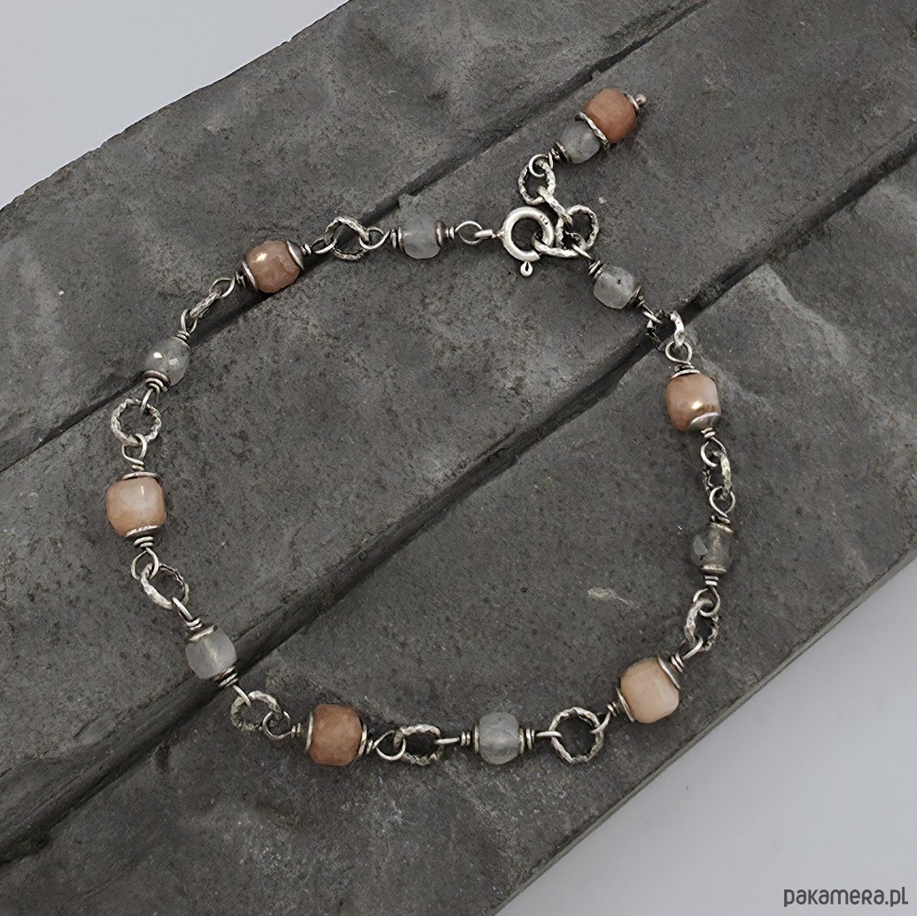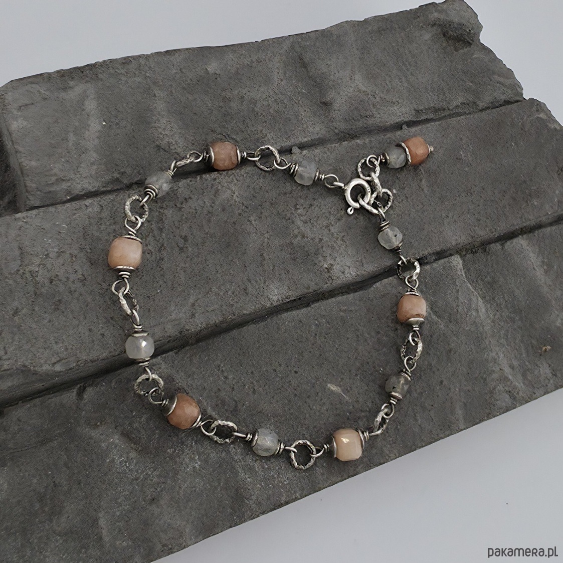 Minimalistyczna i kobieca bransoletka na co dzień. Wykonana w całości z oksydowanego srebra próby 925 oraz fasetowanych kostek kamienia słonecznego i labradorytu wielkości 5 i 4 mm. Całkowita długość bransoletki regulowana od 19 cm do 20 cm. W mojej galerii kolczyki do kompletu. Ozdobnie zapakowana.
