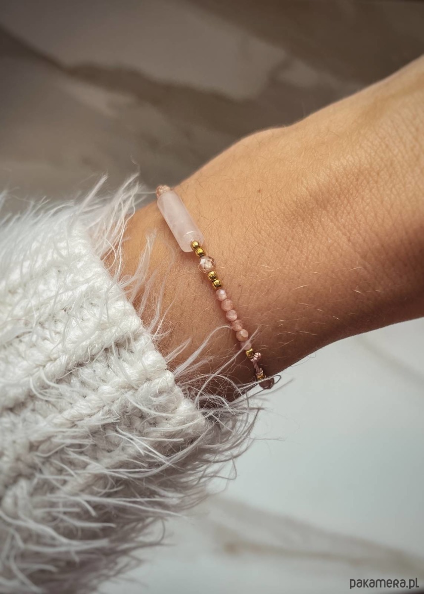 Bransoletka stworzona z wytrzymałej nici jedwabnej, kamieni naturalnych, kamieni miłości - Kwarcu Różowego oraz Rodochrozytu oraz Cyrkonii Szampańskiej. Dodatkowo wykończona jest pozłacanym srebrem próby 925. Bransoletka jest regulowana poprzez pozłacaną, siliknową kulkę, dzięki czemu będzie pasować na każdą dłoń.