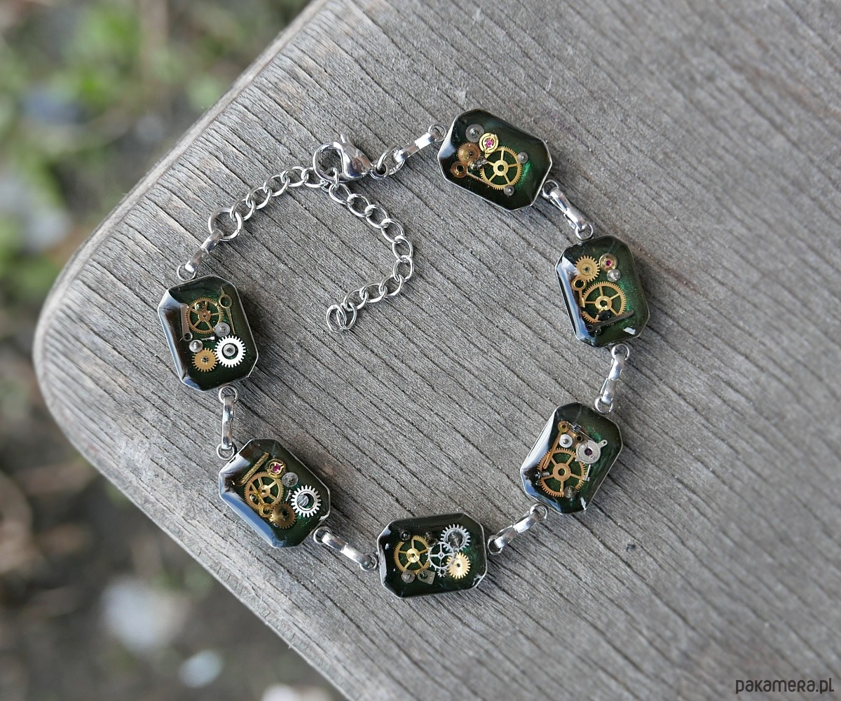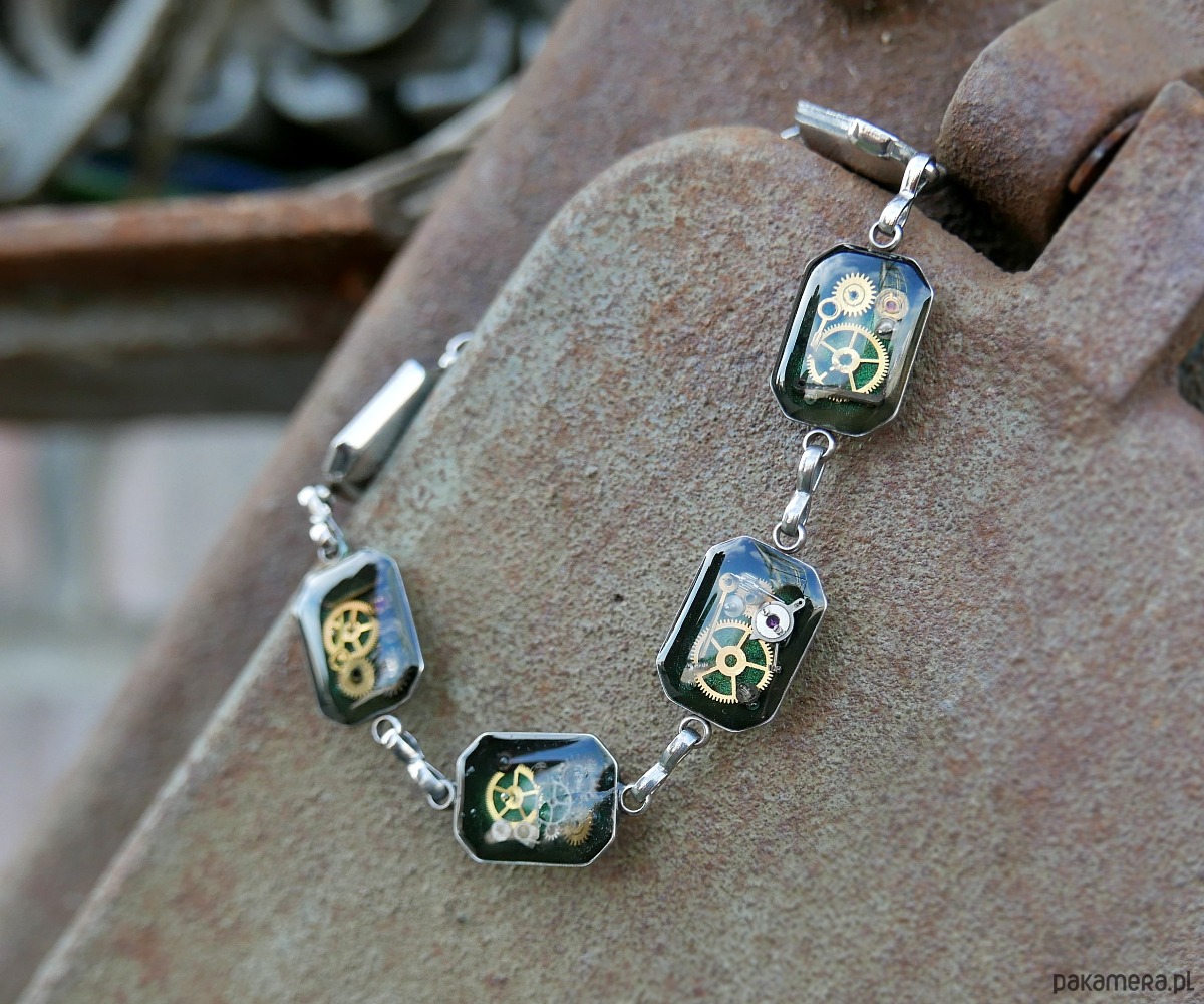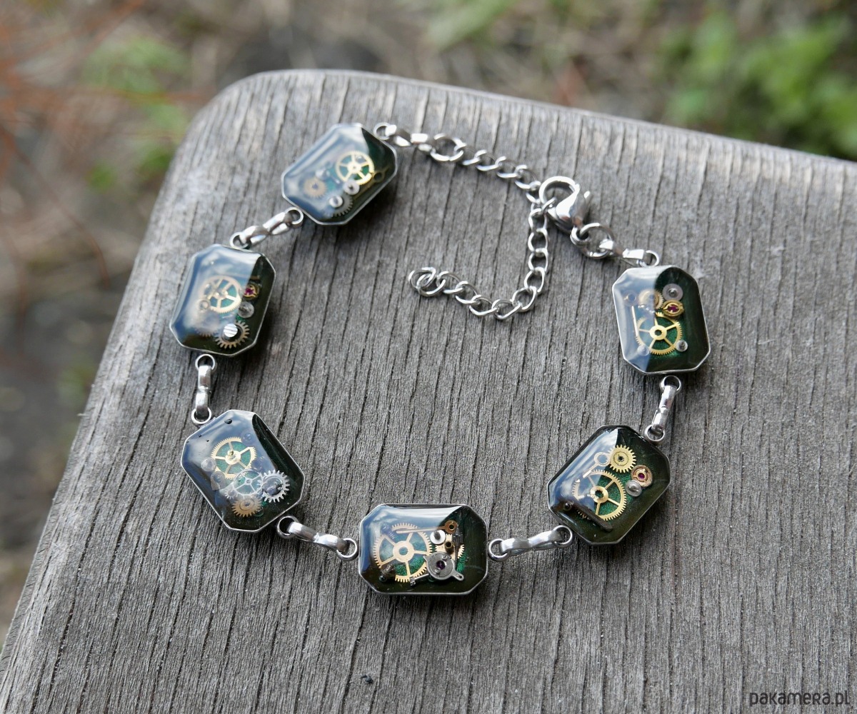 Ta wyjątkowa bransoletka łączy industrialny styl z odrobiną tajemniczości. Wykonana z trwałego metalu, z zatopionymi w żywicy fragmentami zegarka, symbolizuje nieustanny upływ czasu i niepowtarzalność chwili. Regulowana długość zapewnia idealne dopasowanie na każdą rękę. To idealny dodatek dla osób ceniących oryginalność i niebanalny styl.