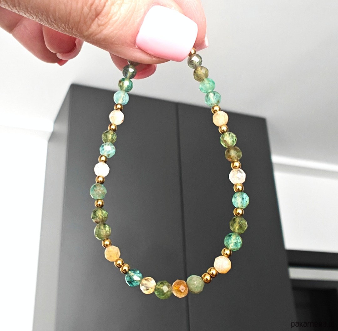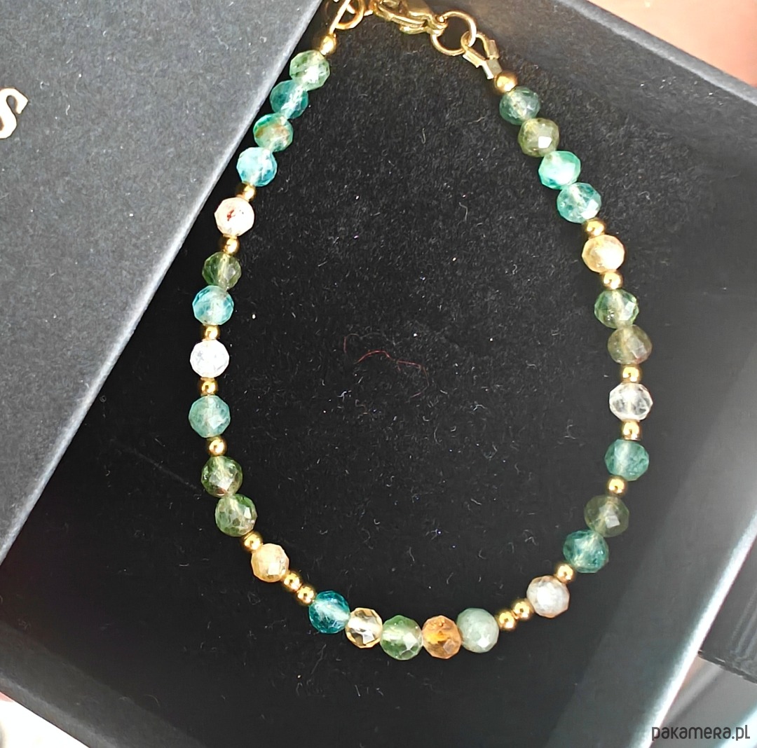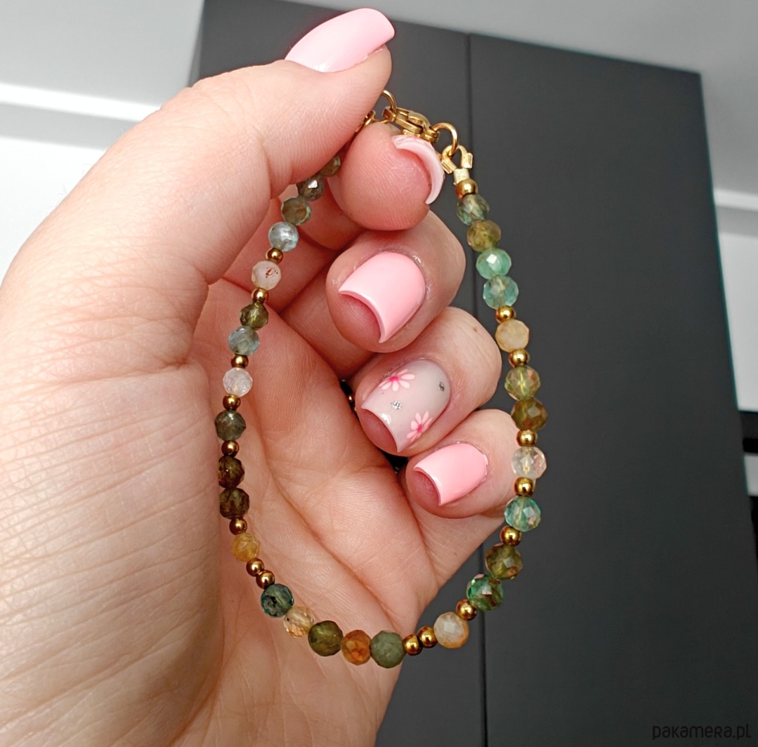 Całość dopełniają elementy ze stali chirurgicznej oraz drobne akcenty ze srebra pozłacanego, które nadają bransoletce delikatnego blasku i trwałości.