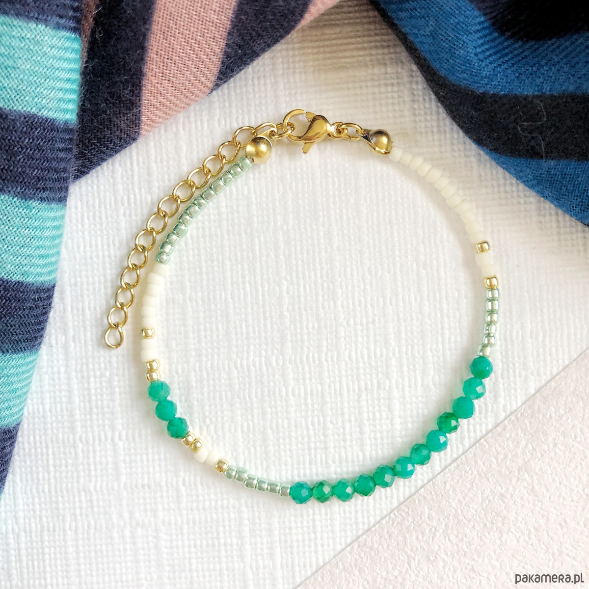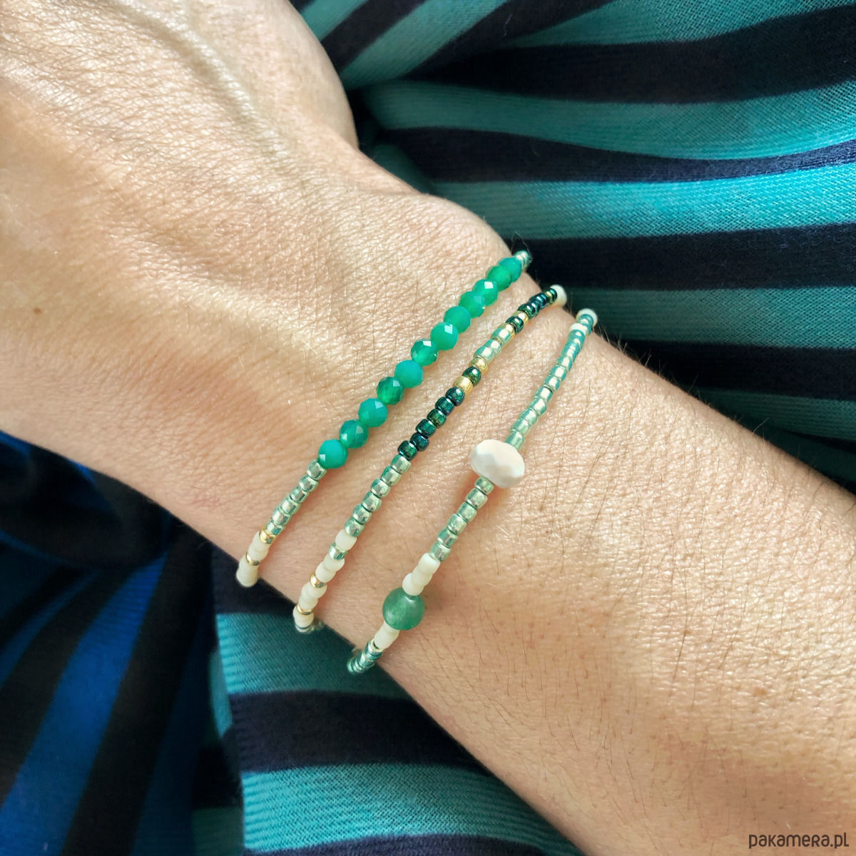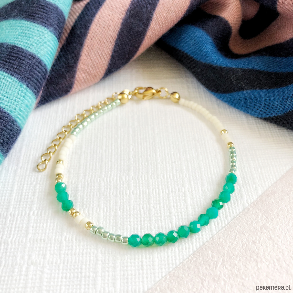 Delikatna, energetyczna bransoletka z drobnych koralików szklanych, kamieni naturalnych zielonego onyksu i stali szlachetnej.