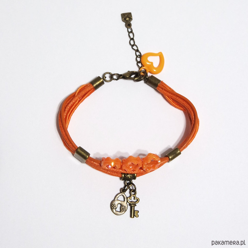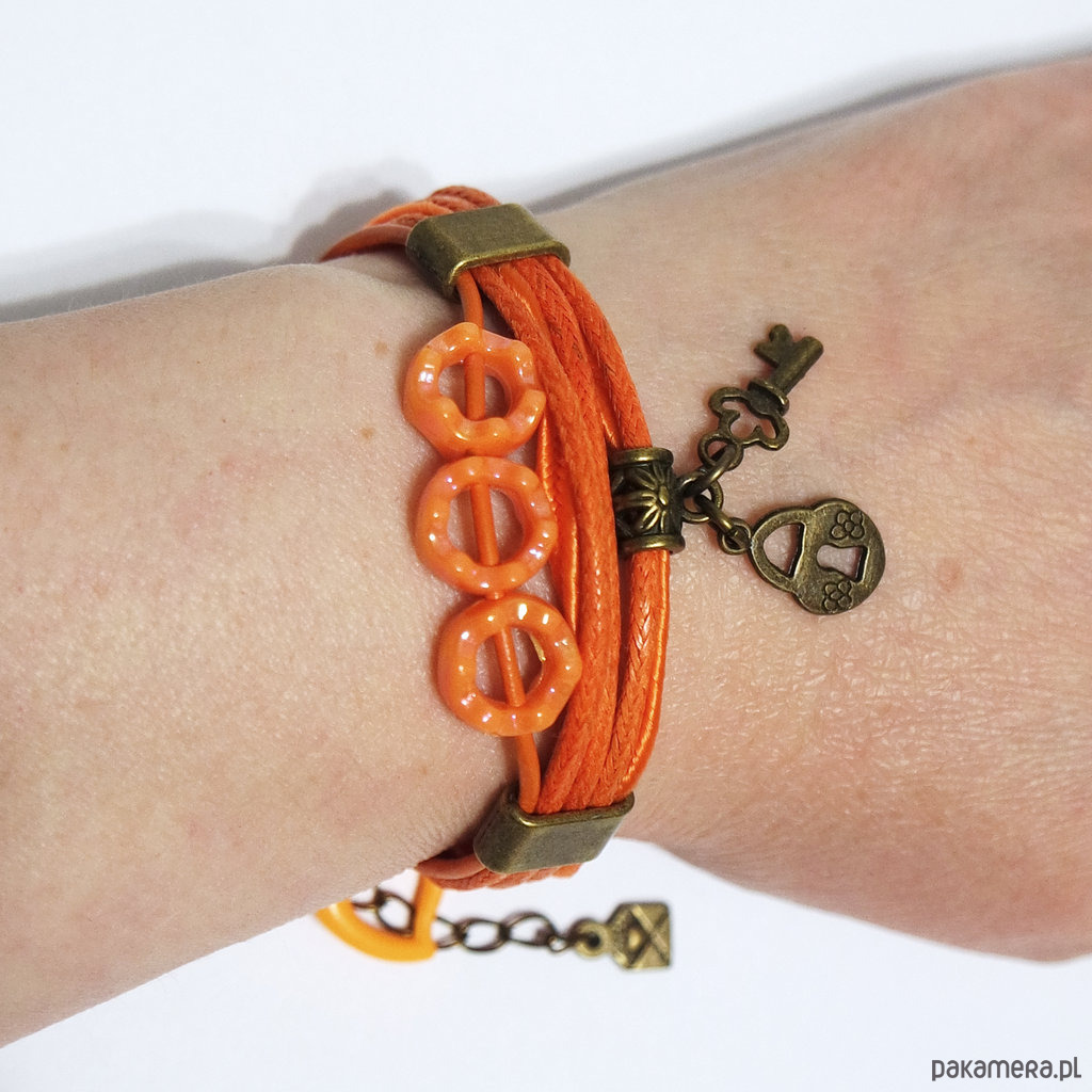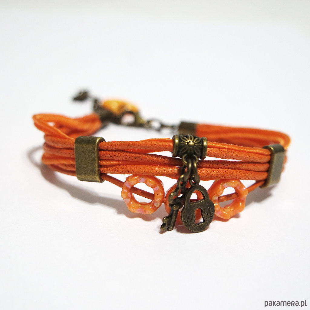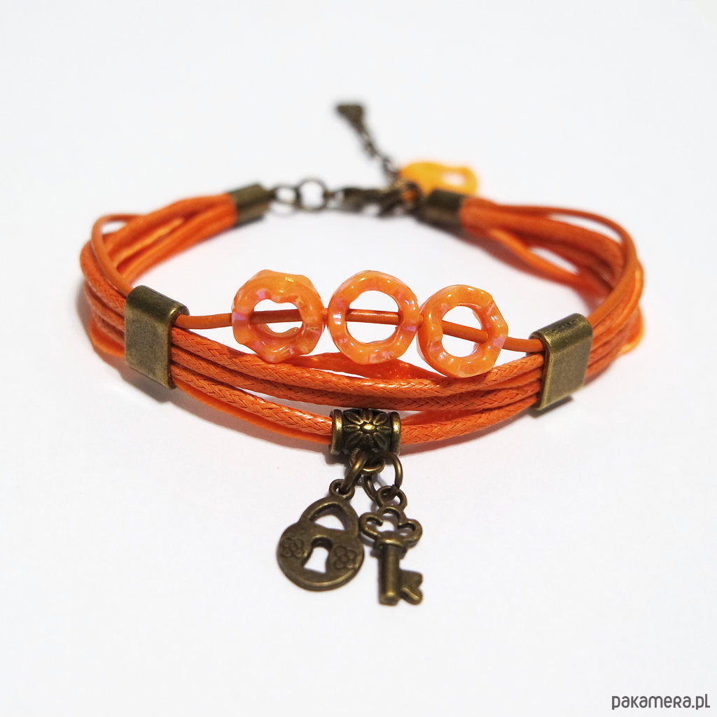 Bransoletka - Kluczyk, kłódka - rzemienie, pomarańczowa