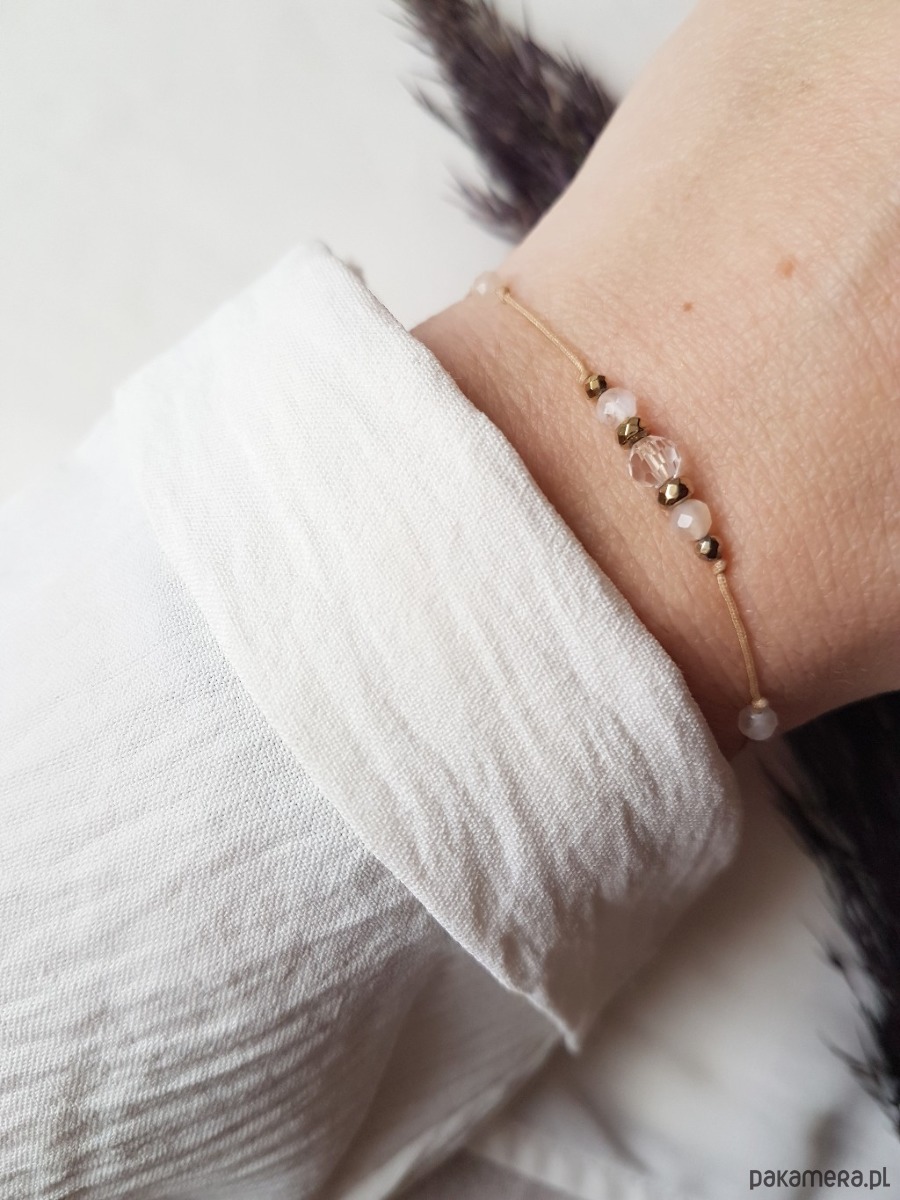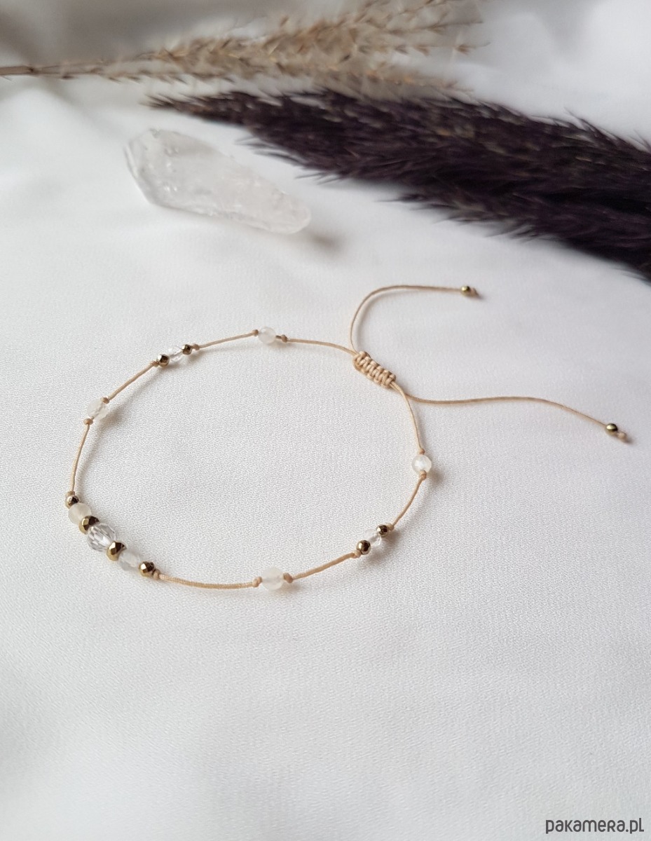 Delikatna bransoletka z Kamieniem Księżycowym oraz Kryształem Górskim na beżowym sznurku.