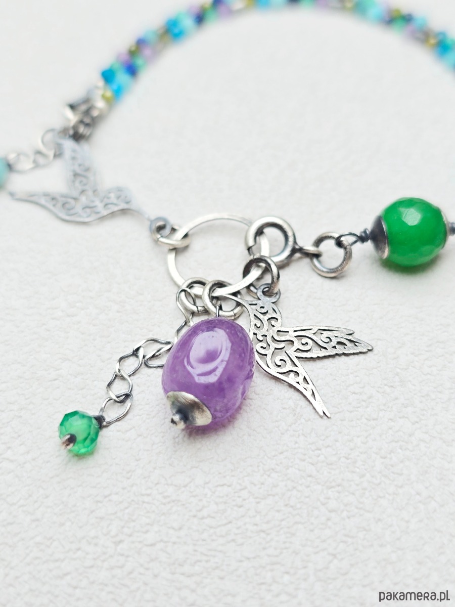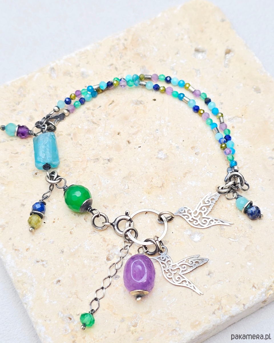 Unikatowa bransoletka z motywem kolibrów. Wykonana z kamieni naturalnych w przedziale wielkosci od 2mm do 8mm tj.: ametyst, lapis lazuli, zielony onyks, zielony turmalin, amazonit, apatyt.