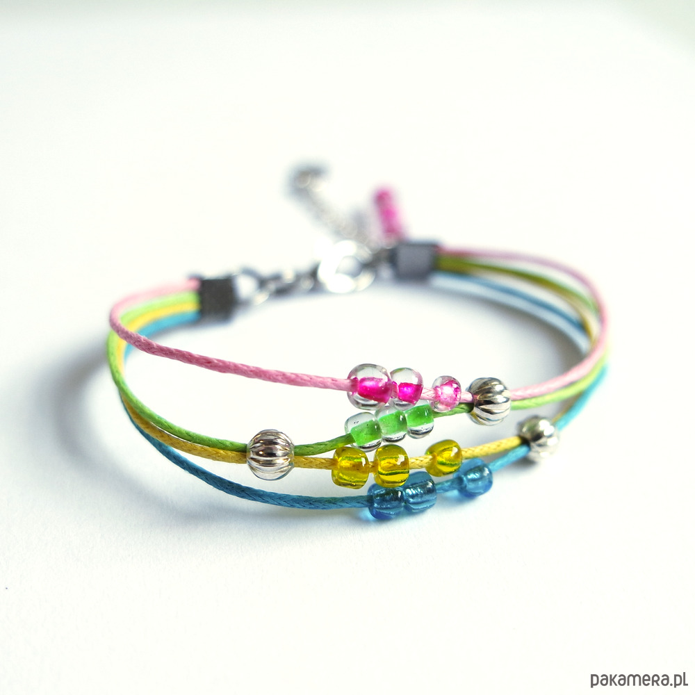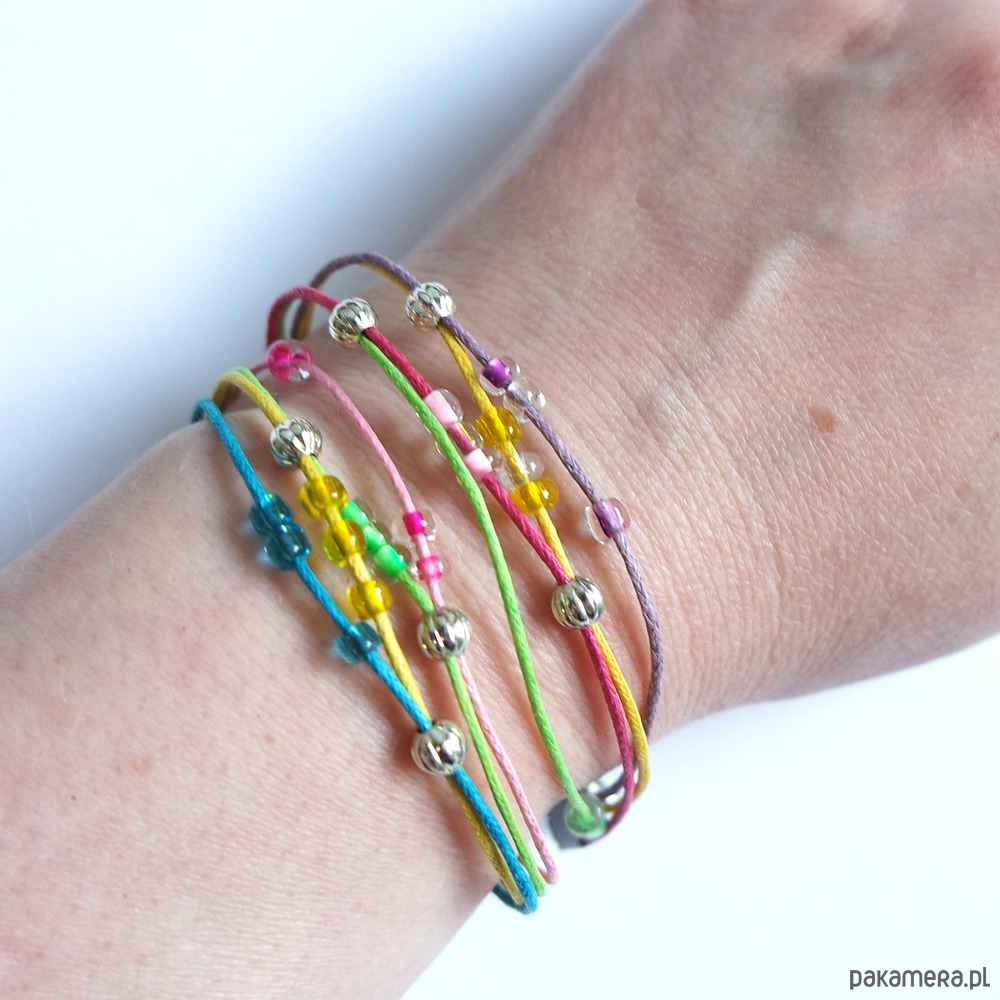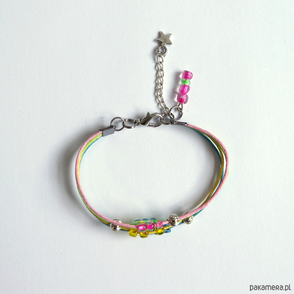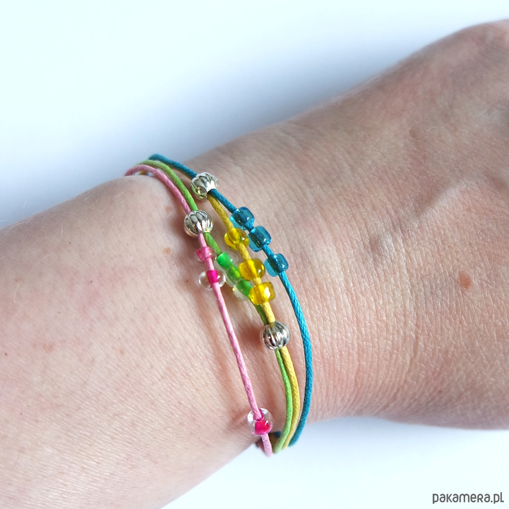 Bransoletka zrobiona jest z woskowanych sznureczków oraz koralików.