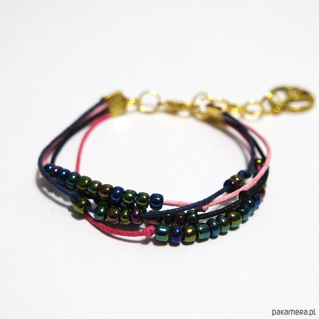 Bransoletka zrobiona jest z woskowanych sznureczków oraz tęczowych koralików.