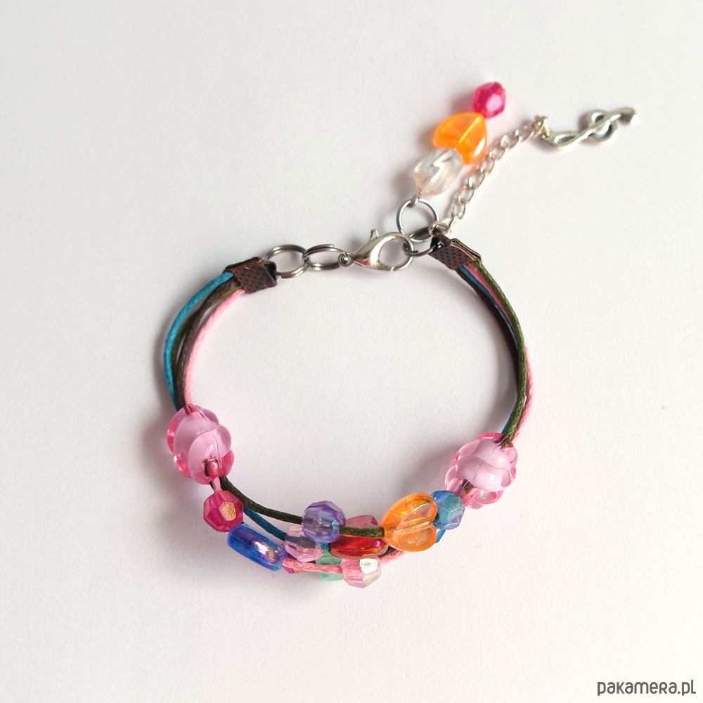 Bransoletka zrobiona jest z woskowanych sznureczków oraz koralików.