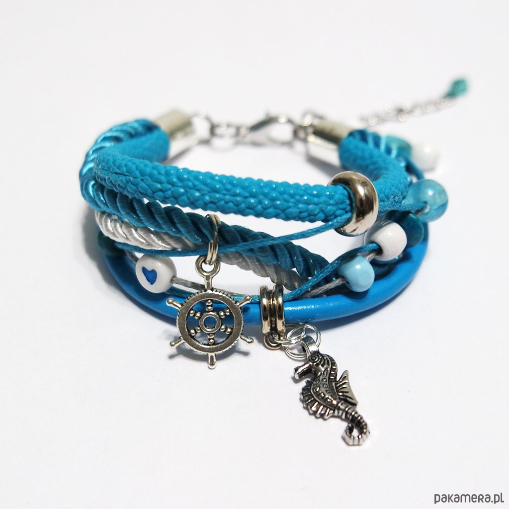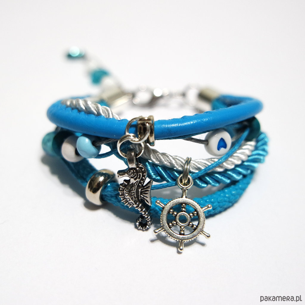 Bransoletka zrobiona jest z rzemieni ze skóry ekologicznej, sznurków oraz przekładek, zawieszek i koralików.
