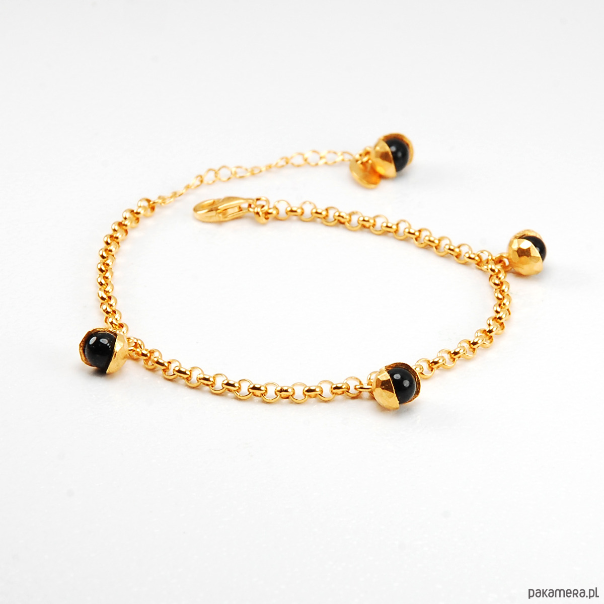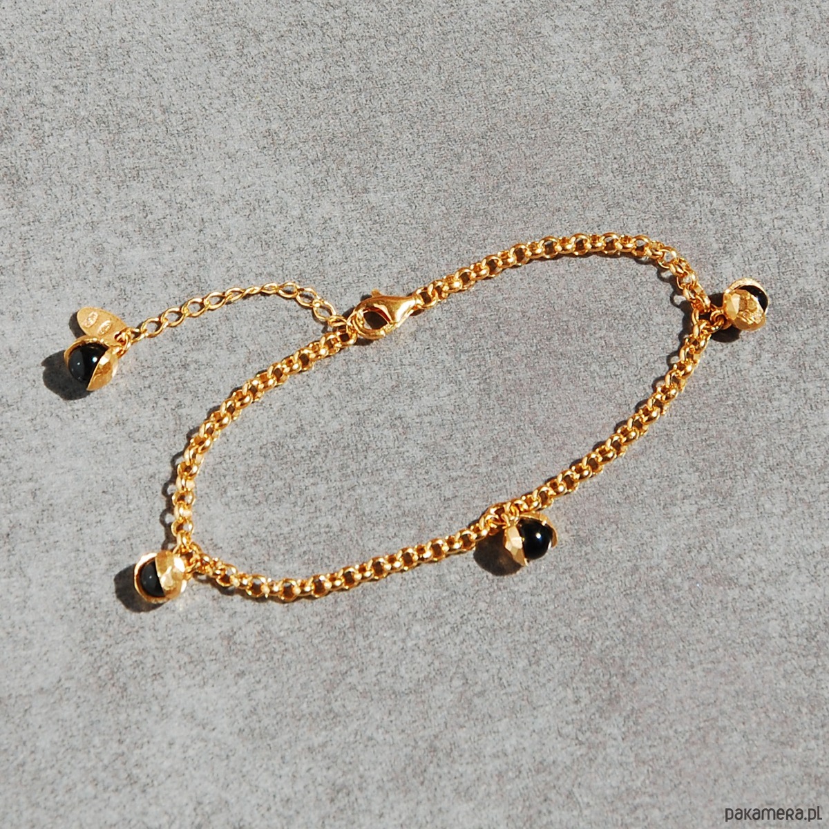 Delikatna bransoletka łańcuszkowa z ruchomymi elementami z naturalnym onyksem . Wykonana ze srebra próby 925 w matowym fasetowanym wykończeniu oraz pokryta warstwą złocenia żółtego o grubości 2 mikronów oraz zabezpieczona nano powłoką, która zabezpiecza złocenie przed szybkim ścieraniem.
