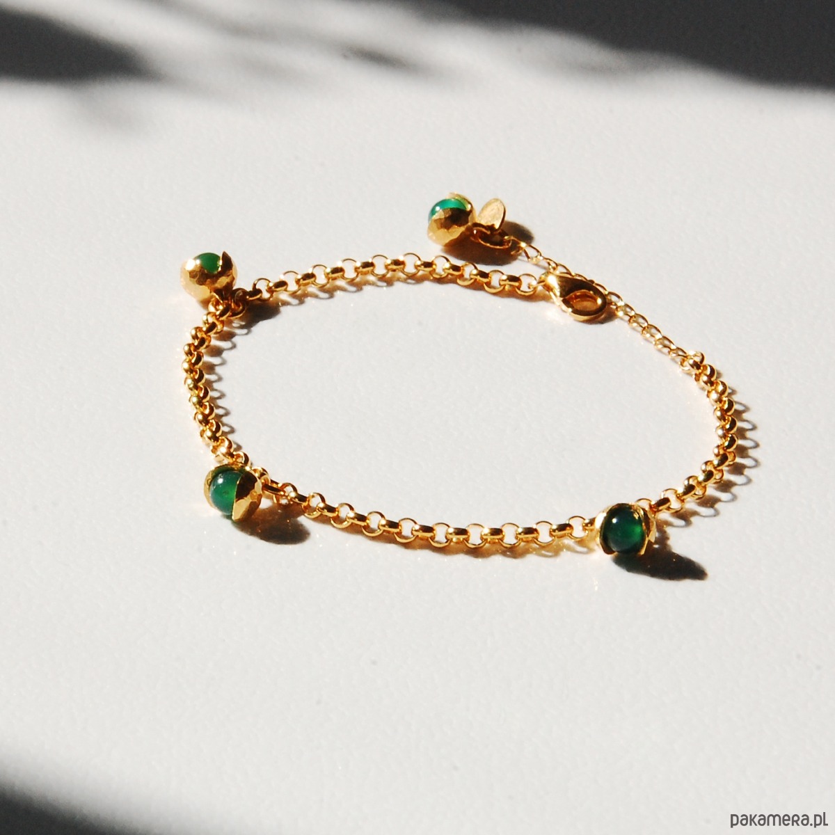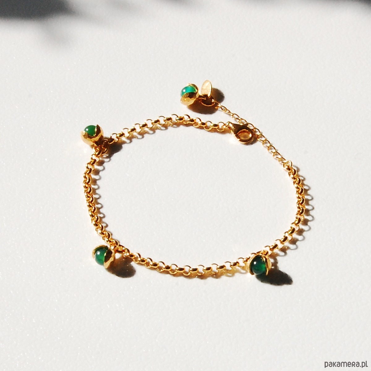 Delikatna bransoletka łańcuszkowa z ruchomymi elementami z naturalnym onyksem zielonym. Wykonana ze srebra próby 925 w matowym fasetowanym wykończeniu oraz pokryta warstwą złocenia żółtego o grubości 2 mikronów oraz zabezpieczona nano powłoką, która zabezpiecza złocenie przed szybkim ścieraniem.