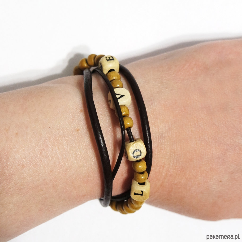 Bransoletka zrobiona jest z rzemieni ze skóry naturalnej w kolorze ciemnego brązu oraz drewnianych koralików.