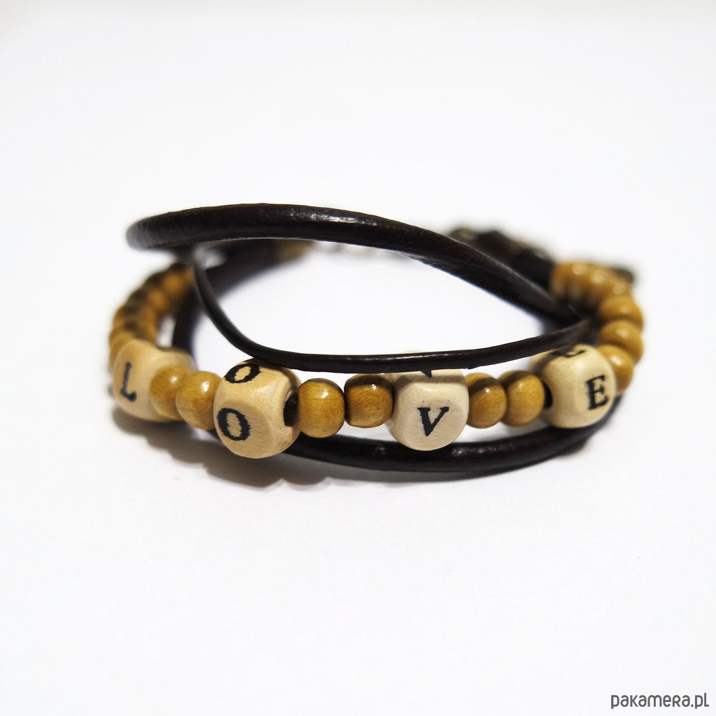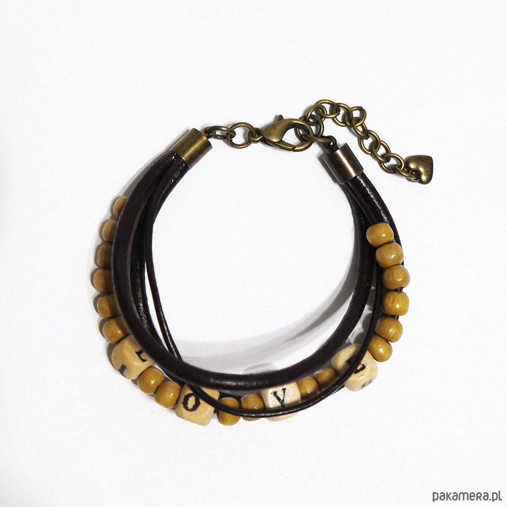 Bransoletka - Koraliki drewniane LOVE - rzemienie skórzane brązowe