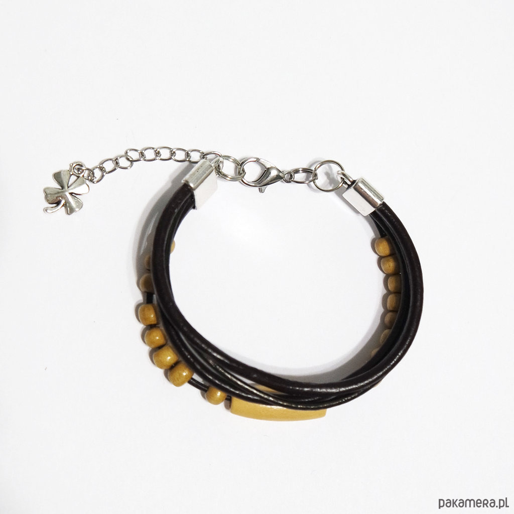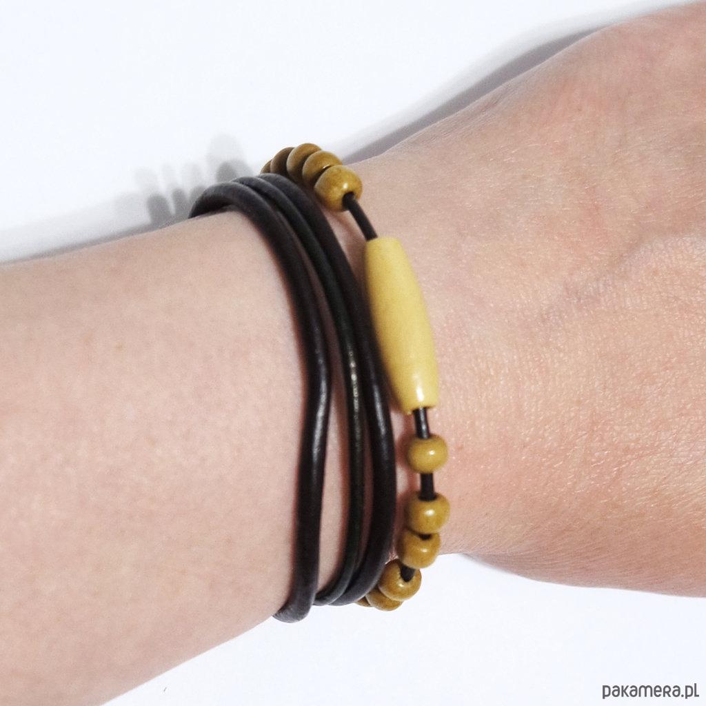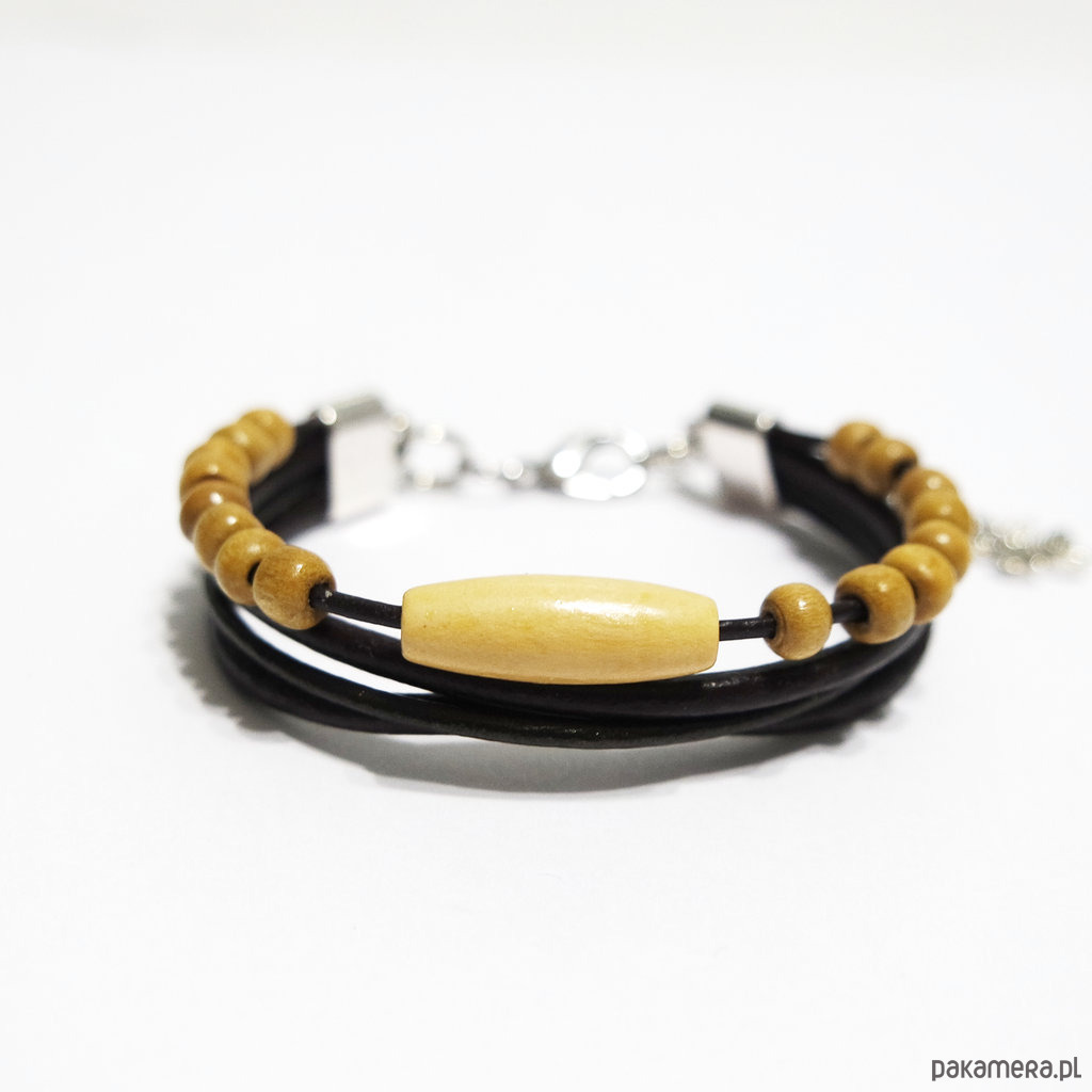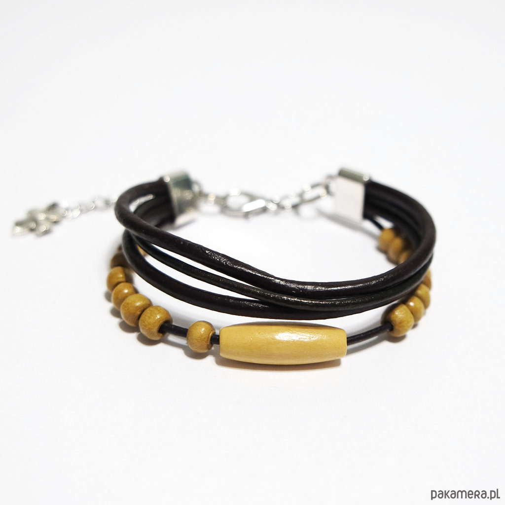 Bransoletka zrobiona jest z rzemieni ze skóry naturalnej w kolorze ciemnego brązu oraz drewnianych koralików.