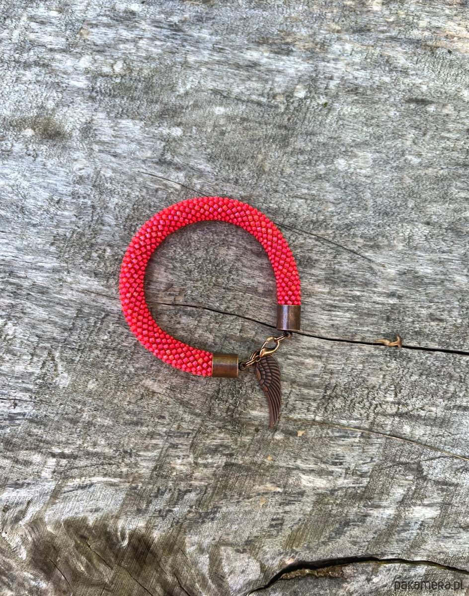 Bransoletka wykonana ręcznie z ponad tysiąca japońskich szklanych koralików w intensywnym neonowym malinowym kolorze. Wykończona elementami z metalu w kolorze miedzi.