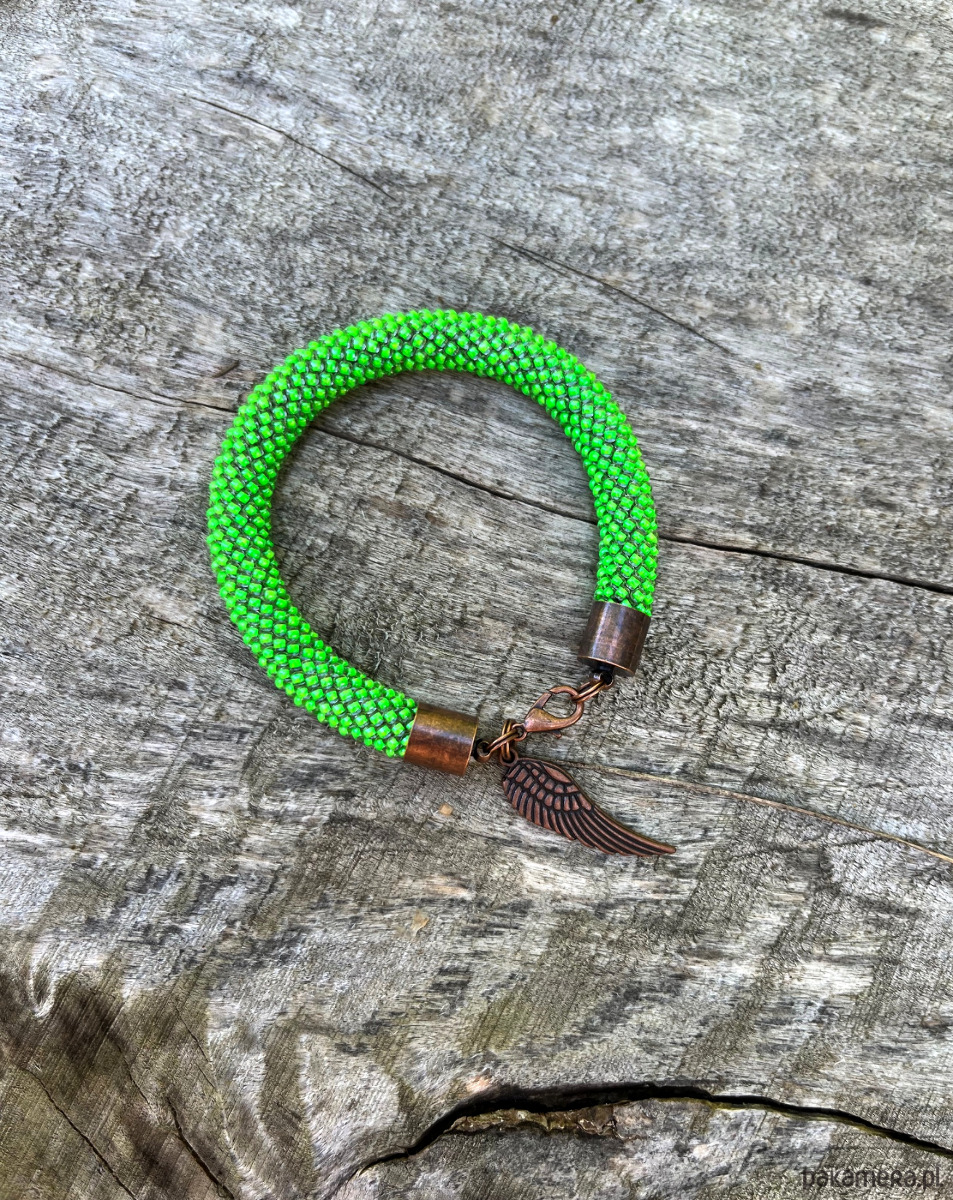 Bransoletka wykonana ręcznie z ponad tysiąca japońskich szklanych koralików w intensywnym neonowym zielonym kolorze. Wykończona elementami z metalu w kolorze mosiądzu.