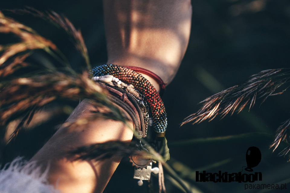 Bransoletka wykonana pracochłonną techniką z ponad tysiąca szklanych koralików. Wykończona elementami z metalu w kolorze mosiądzu. Całkowita długość bransoletki wraz z zapięciem około 20 cm. Grubość sznura koralikowego około 10 mm. Bransoletka nie jest sztywna, bardzo miękko układa się na nadgarstku.