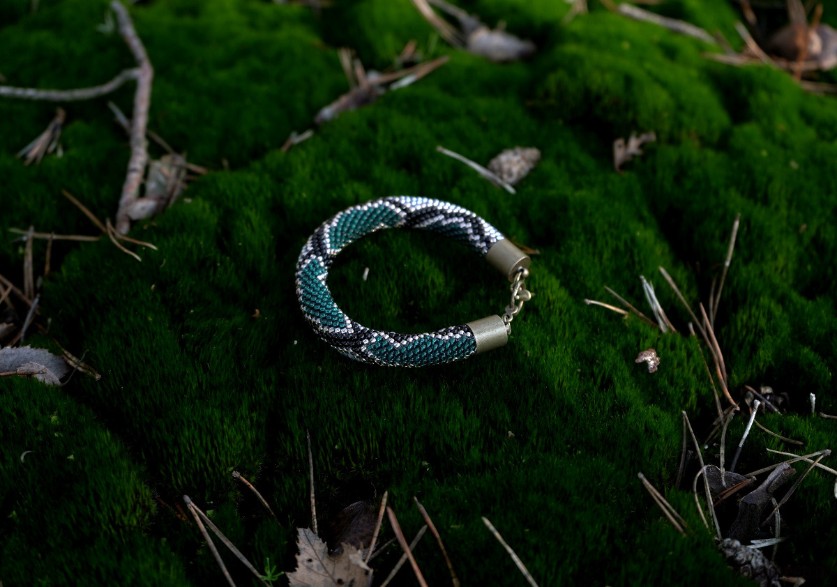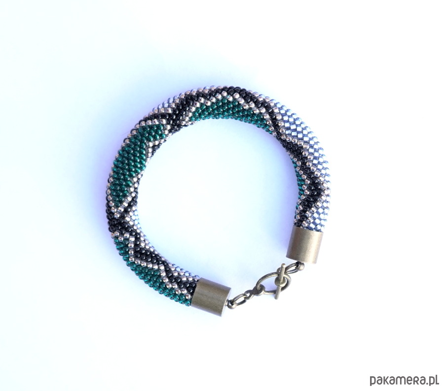Bransoletka w wężowy wzorek wykonana ręcznie z ponad tysiąca japońskich szklanych koralików. Wykończona elementami z metalu w kolorze mosiądzu. Całkowita długość bransoletki wraz z zapięciem około 20,5 cm. Grubość sznura koralikowego około 10 mm.