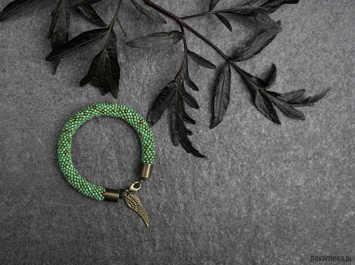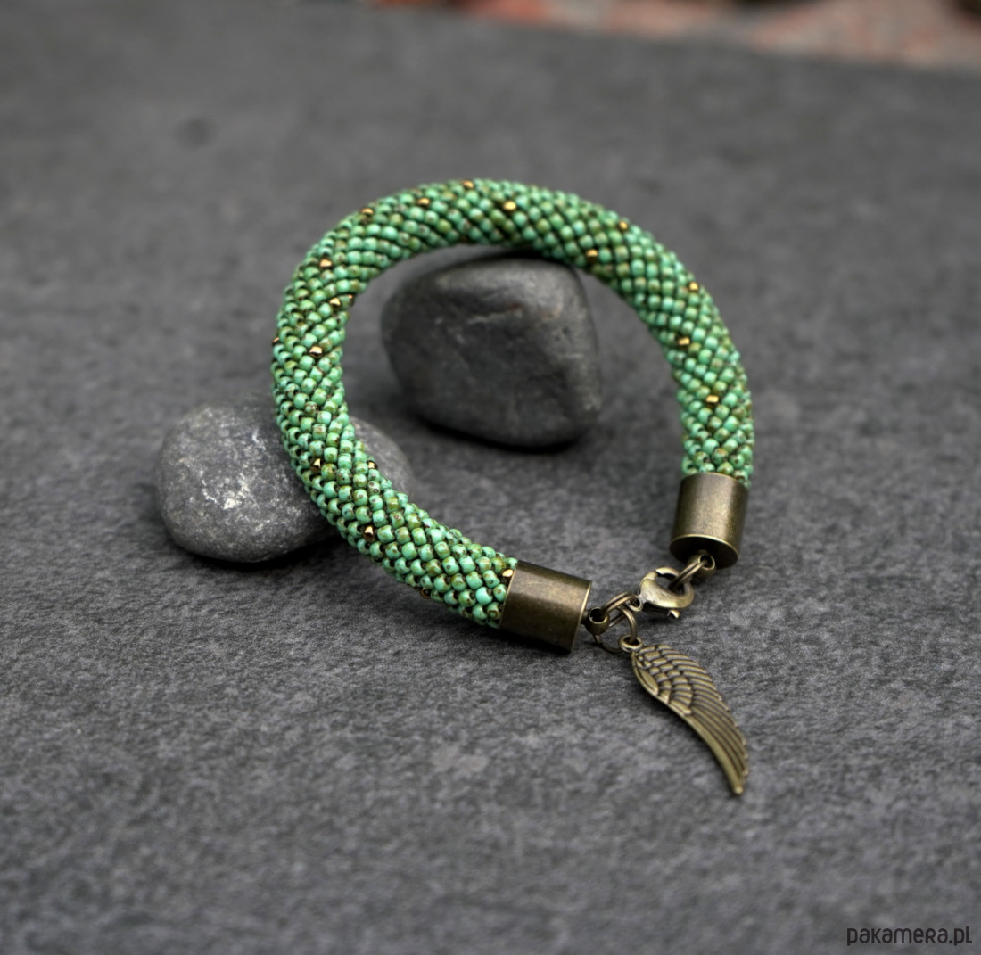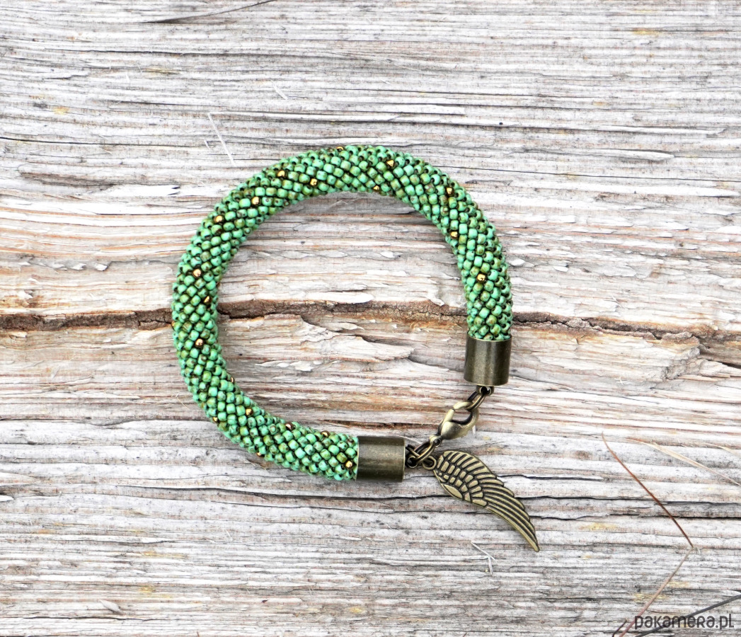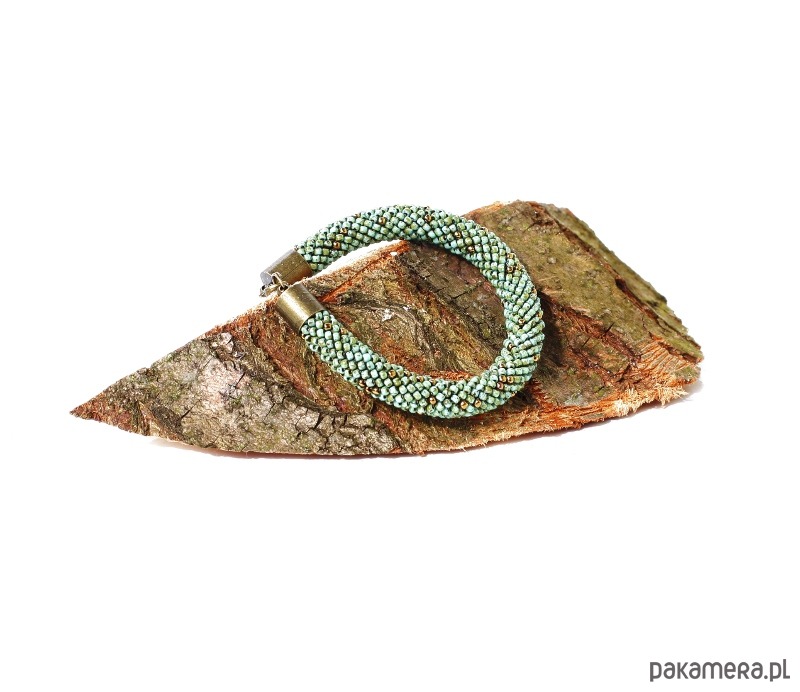 Efektowna bransoletka wykonana ręcznie z ponad tysiąca japońskich szklanych koralików. Wykończona elementami z metalu w kolorze mosiądzu. Całkowita długość bransoletki wraz z zapięciem około 19,5 cm. Grubość sznura koralikowego około 9 mm.
