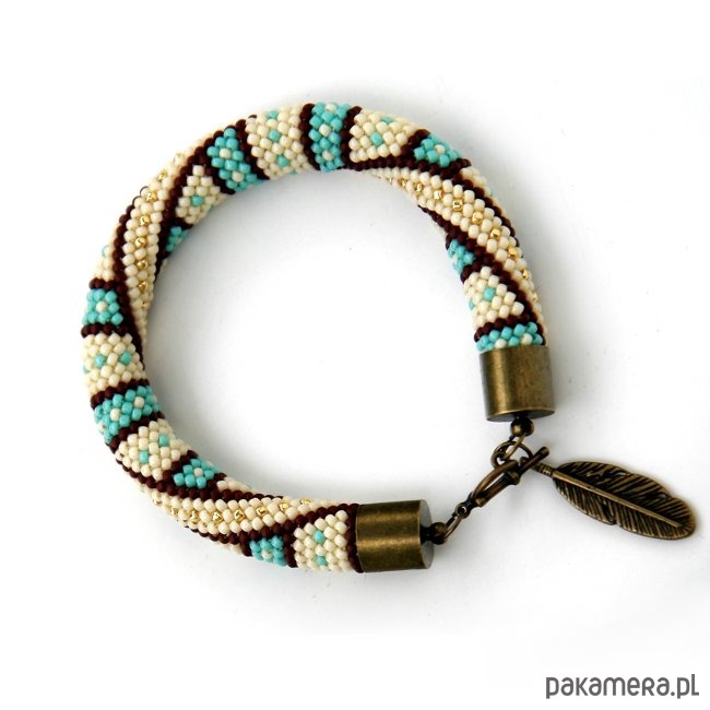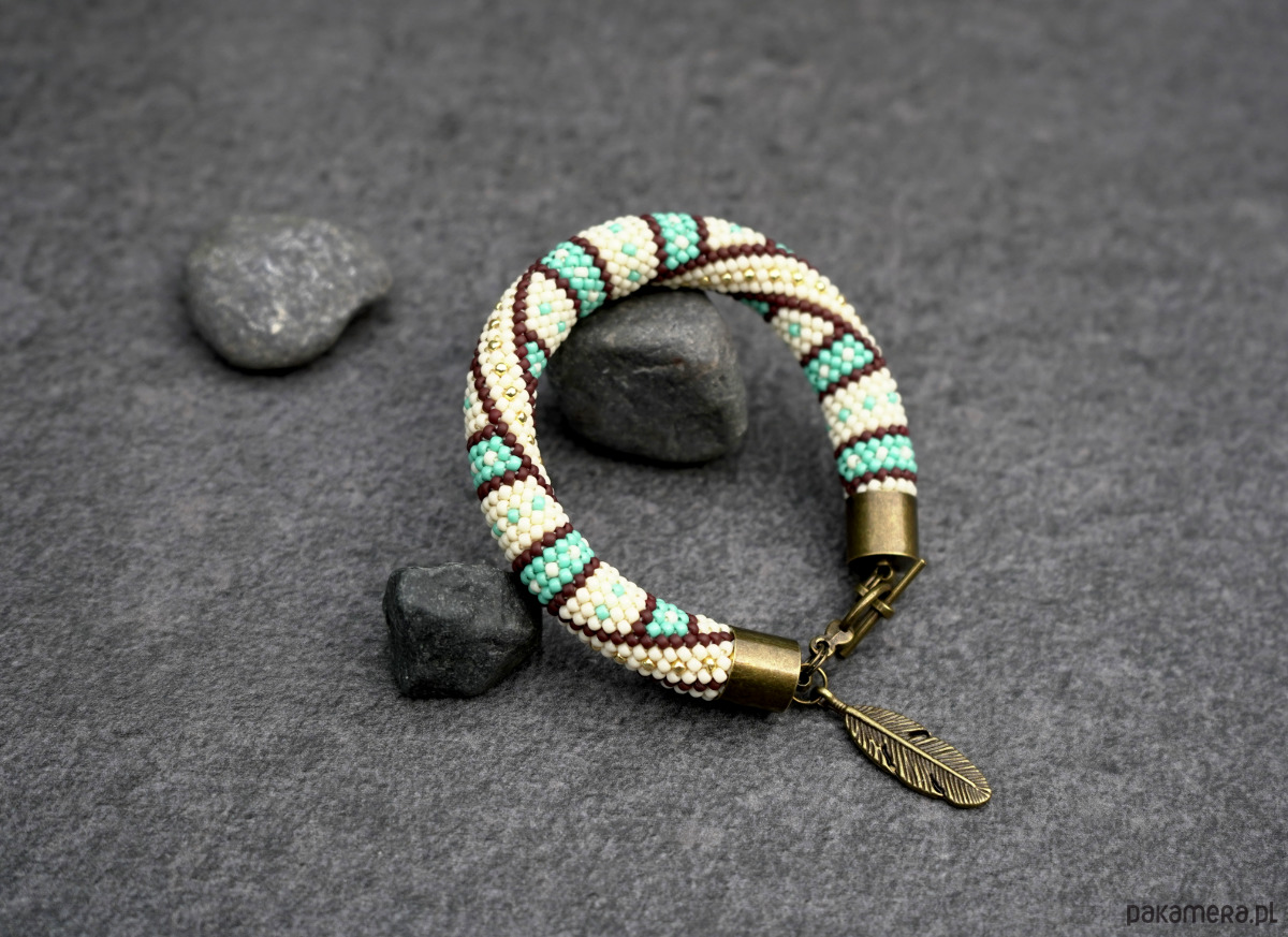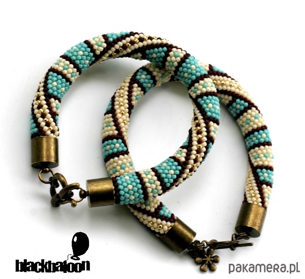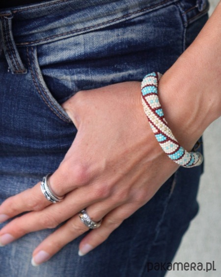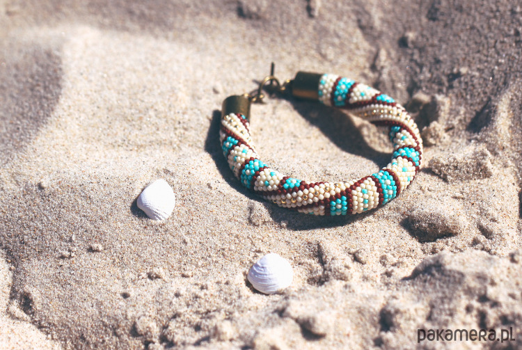 Bransoletka wykonana ręcznie pracochłonną techniką z ponad tysiąca japońskich szklanych koralików. Wykończona elementami z metalu w kolorze mosiądzu z fantazyjnym zapięciem typu toggle w kształcie kółka. Długość bransoletki około 20 cm. Grubość sznura koralikowego 12 mm.